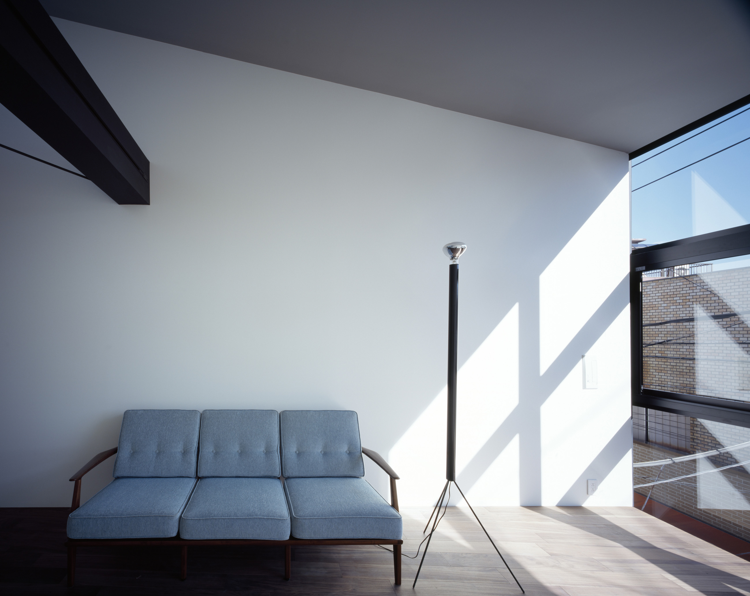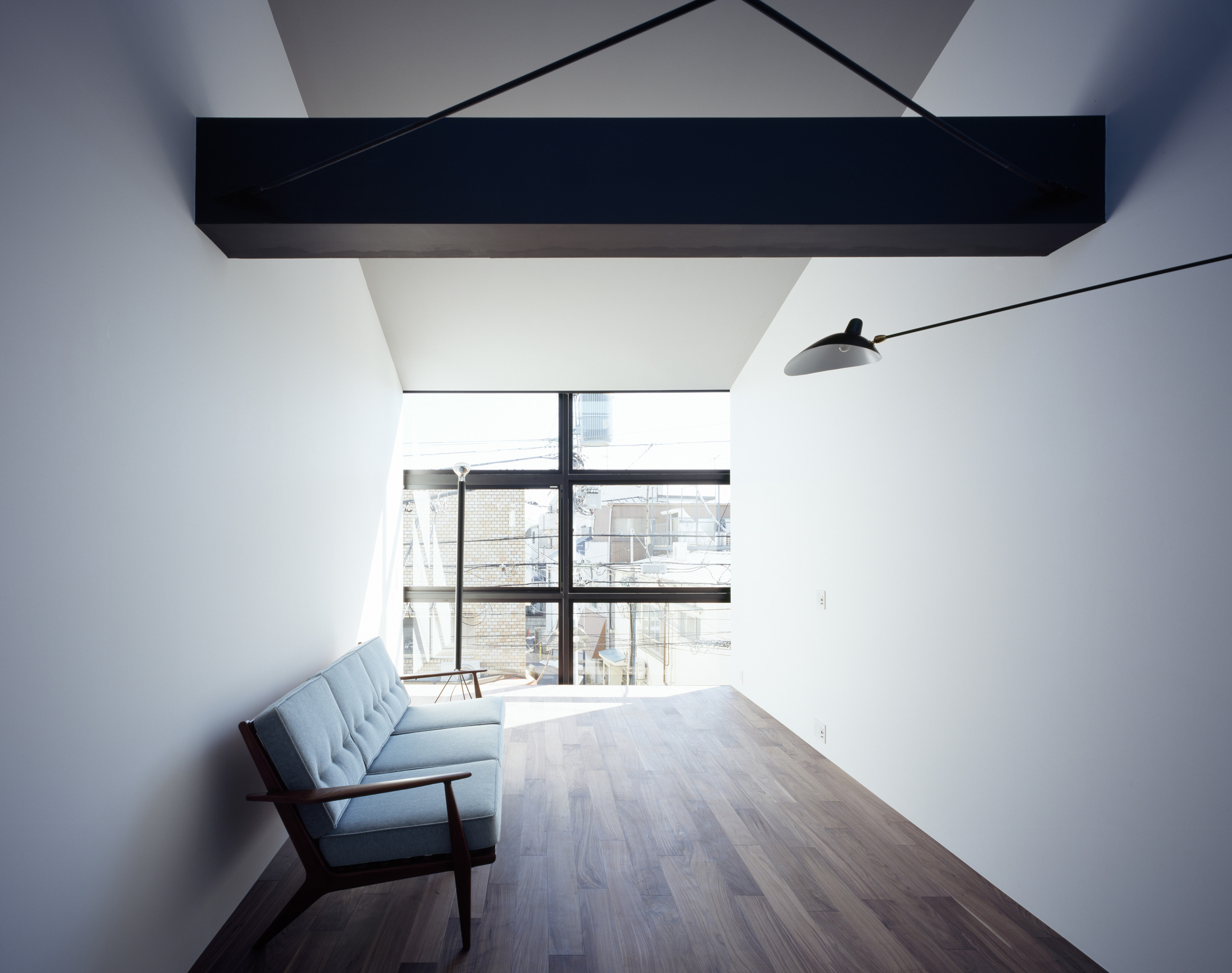3階のファミリールームは限られた間口寸法を補うために奥行きを最大限に生かし視線を通し、吹き抜けを設けることで十分な空間量と高窓から降り注ぐ光のシャワーを存分に味わうことができる。さながらショップのような雰囲気を併せ持つこの住宅は、商業地域に建つ意義を備えた次世代の狭小住宅のスタイルを有している。