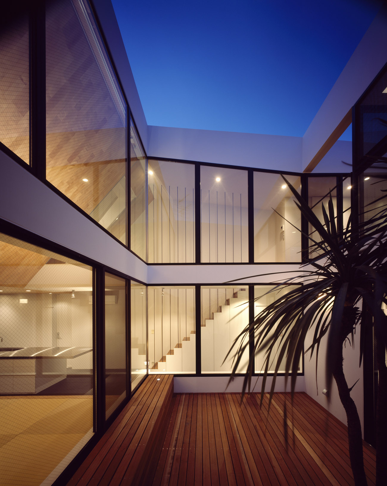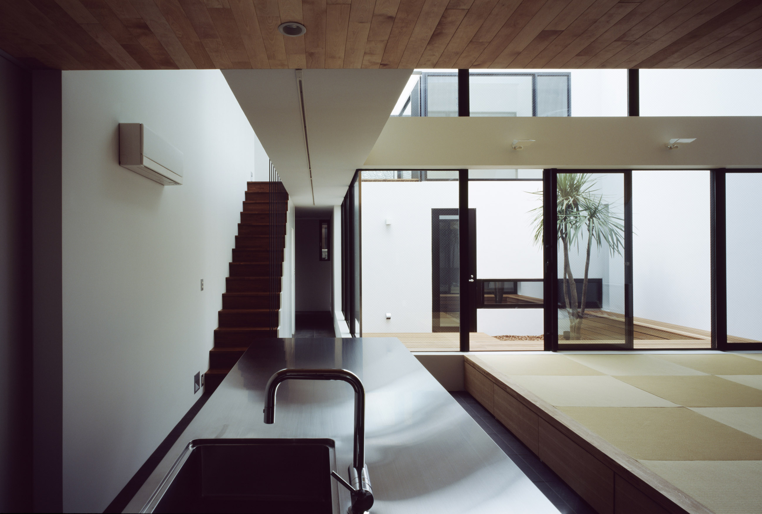This home located in a tranquil downtown residential district sits on a flagpole-shaped lot, whose narrow frontage widens towards the back of the property. Although the approach gives a closed-off impression, the inner area with its central garden is open and spacious, forming a unique universe insulated from the outside world. With a dining room and custom-made kitchen adjacent, the courtyard provides a place where the clients, a couple, can enjoy swaying in their hammock or sipping a glass of wine as they barbeque. The meditation room and study, in contrast, offer private space for spending time alone. This hideaway in the midst of the city is like the ultimate vacation resort for its urban inhabitants.