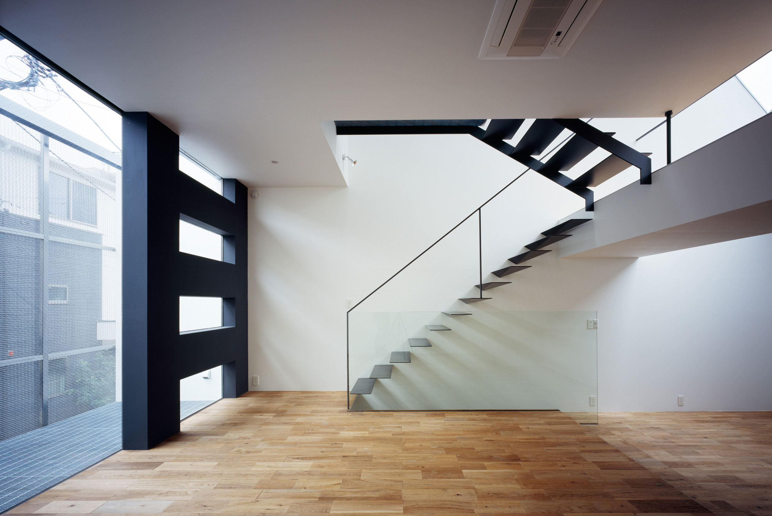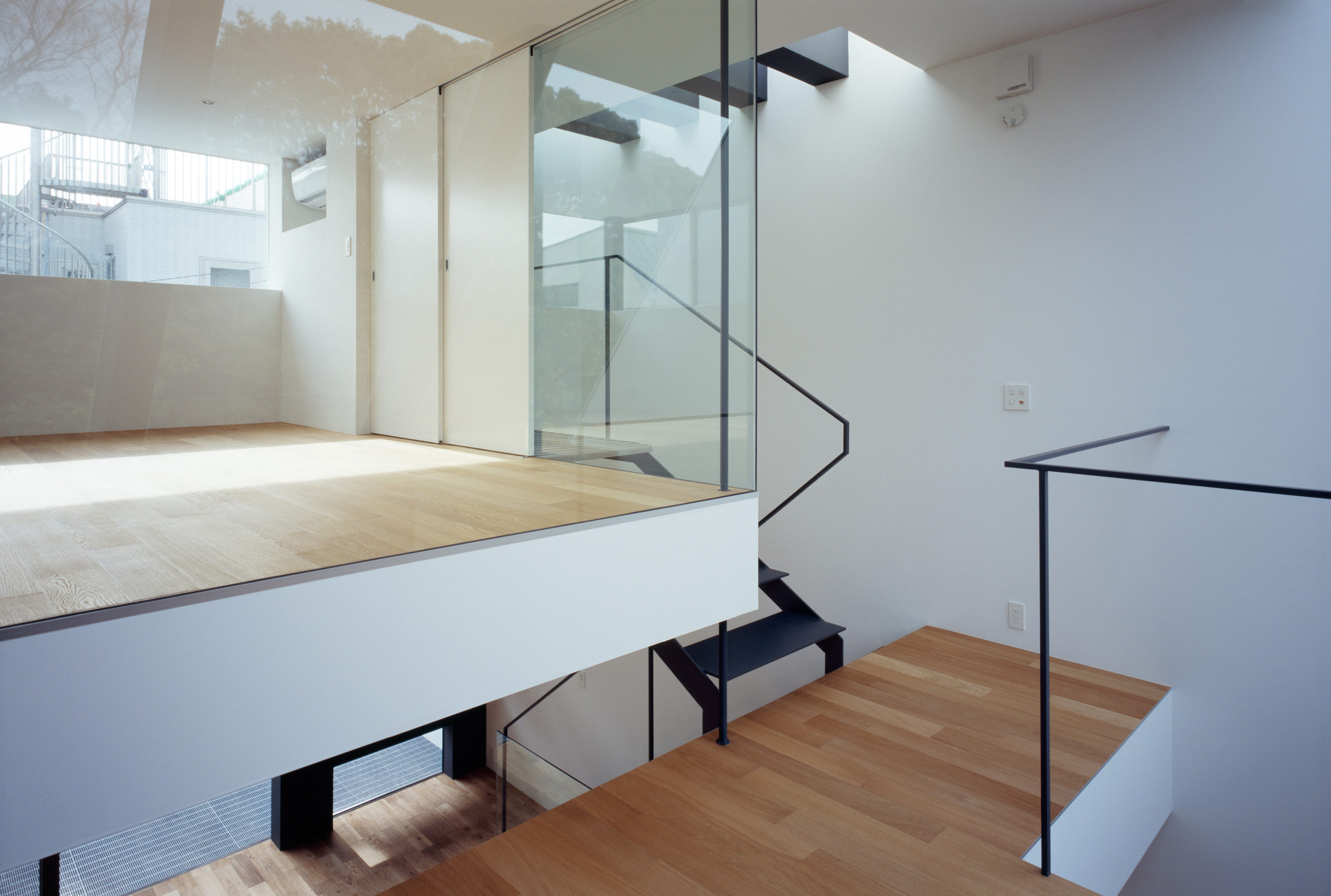 内部は北側斜線の影響を受ける3階の傾斜屋根を生かしたスキップフロアの構成。2階リビングから借景の特等席となるスタディルームや子供室に微妙なレベル差を設けることで室内に浮遊感を生みだしている。北側の傾斜天窓から見える緑景がモノトーンの室内に彩りを与え、光や影と組み合わさることでドラマティックな空間を生み出している。妻側のフルオープンの大開口を実現するために設けた格子状の木造耐力が室内意匠としても程良いアクセントを生みだしている。また、一枚の鉄板を溶接してつくりあげた三角断面のミニマルなキャンティ階段は美しいアートピースとして壁面を彩り、南面大開口や階段上部の天窓からの採光によって美しい陰影が浮かび上がる仕掛けだ。スチールロッドで天井から吊られた子供室はさながらツリーハウスのような心地良さがあり、ステップに腰掛けながら空の景色を楽しむことが可能。コンパクトな一室空間でありながらも、計算しつくした複雑な仕掛けを随所に施すことで、豊かな空間が生まれる。それこそがまさしく日本の都市住宅の真骨頂である。