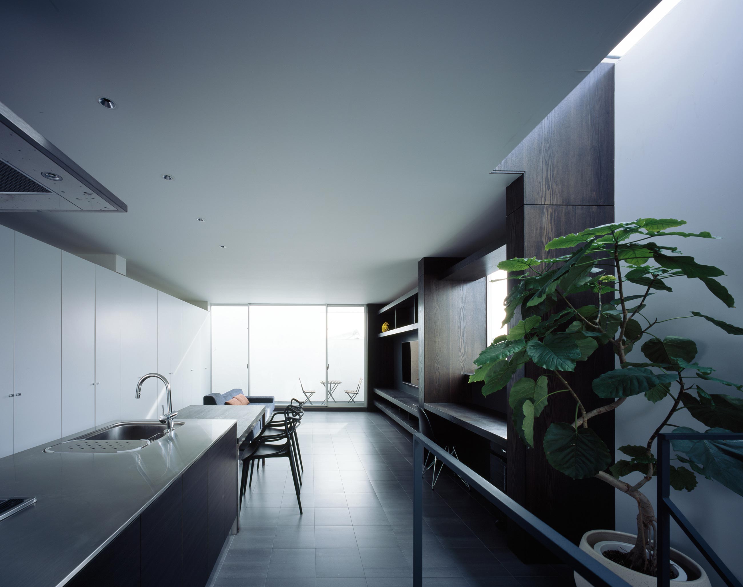 A staircase is provided for approaching to the entrance dedicated to the residence part. Direct access is provided to the 2nd floor level with gathered private spaces and water section, and to the 3rd floor level with a family room. Those spaces are lit by daylight from the top light above the staircases and the balcony, adding gentle atmosphere to the spaces.