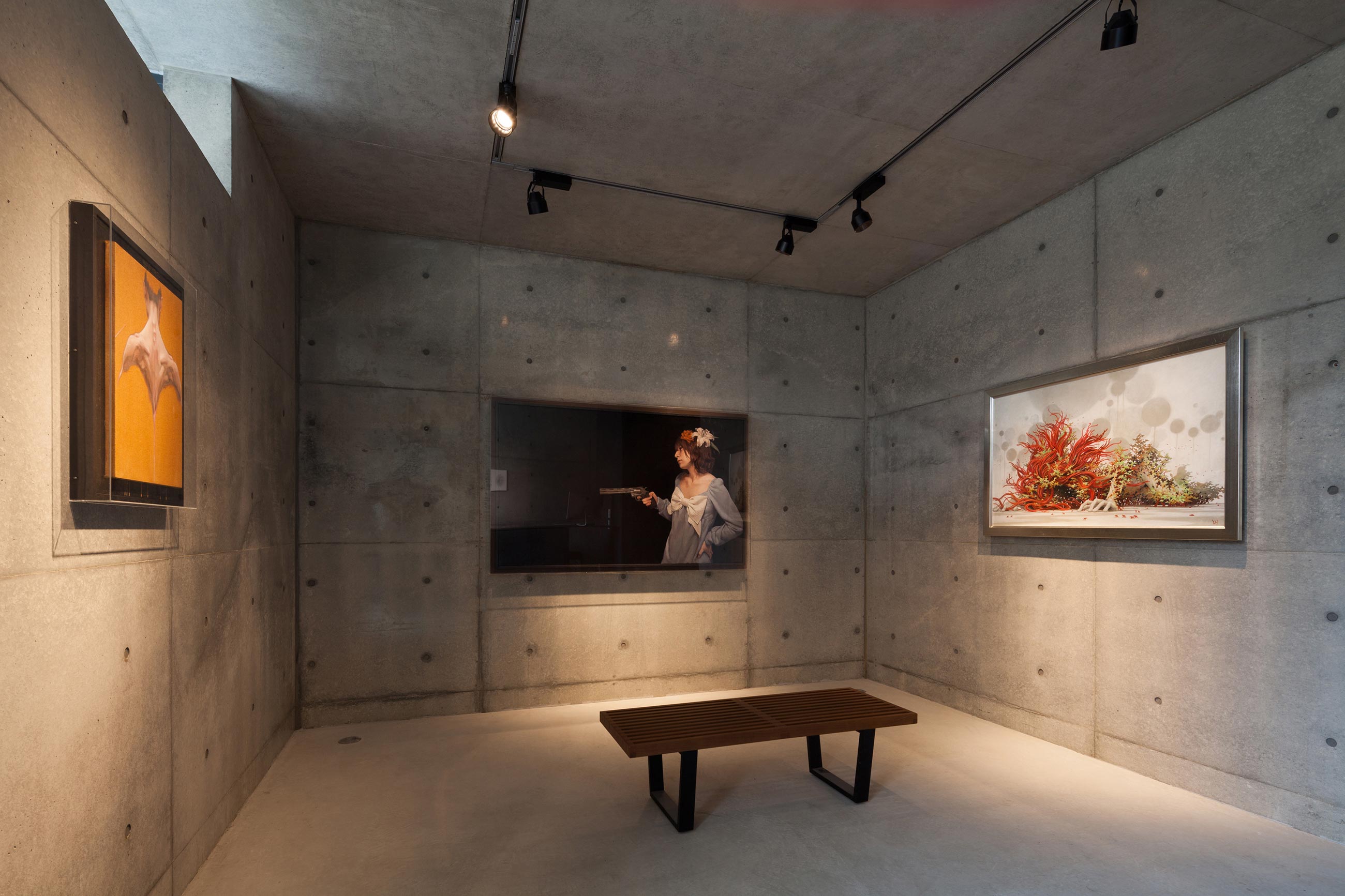 The 2nd floor level is cantilevered, in order to provide a garage space in pilotis style for two cars on the 1st floor level. The 1st floor podium is fully glazed on the street side for giving good visibility of the gallery. The floor level of the gallery space is lowered as a semi-underground sunken space to be magnetic, while a concrete partition provided inside of the space blocks the direct daylight, allowing visitors to the gallery appreciate art pieces via reflected light on the ceiling.