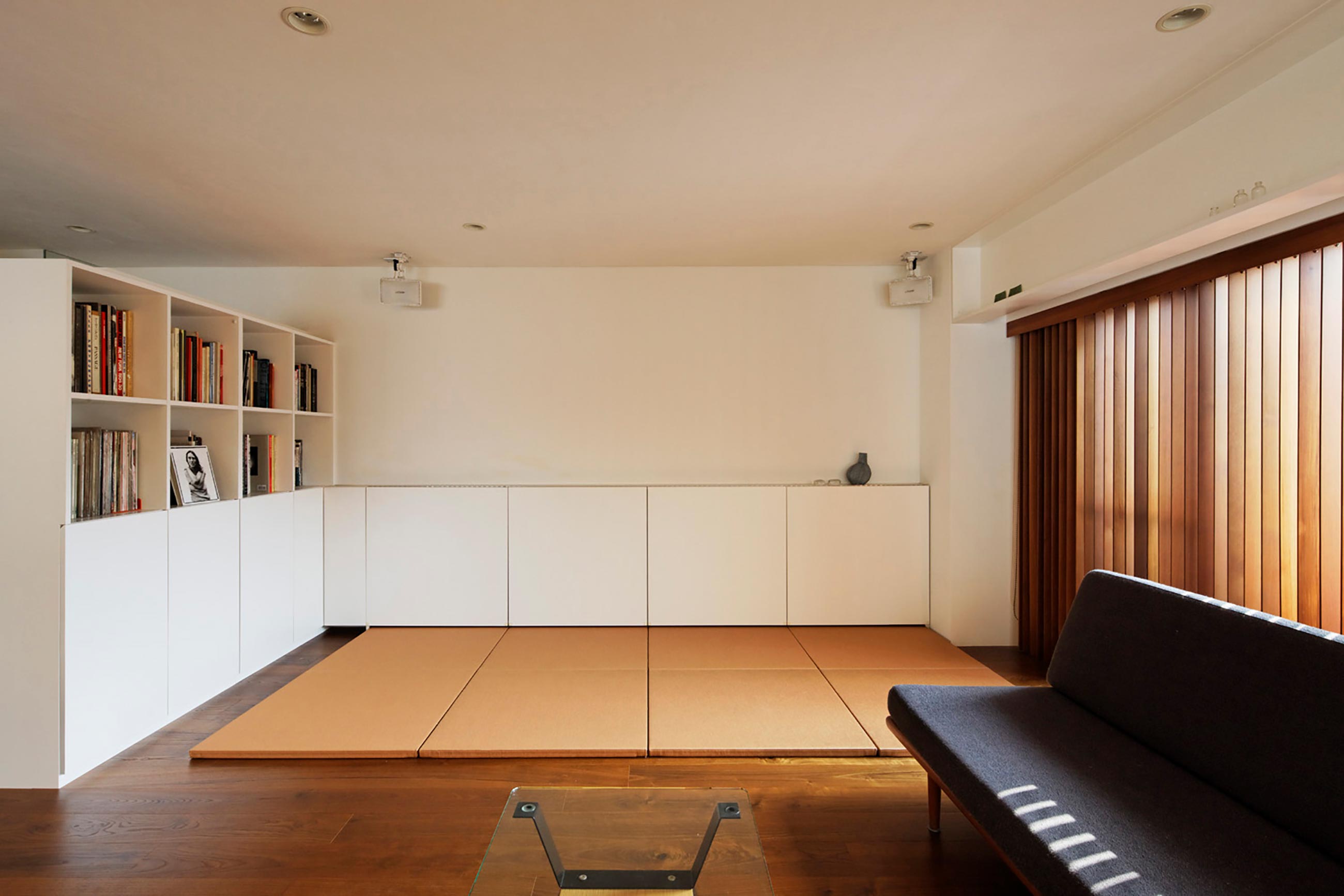 This one room renovation in a flat started with her wish to live with her kids while concentrating on her creative work. Modernity and composure emerges from the darksome floorings and the timber vertical blinds. Her originality can be sensed with her furniture bracing the atmosphere.