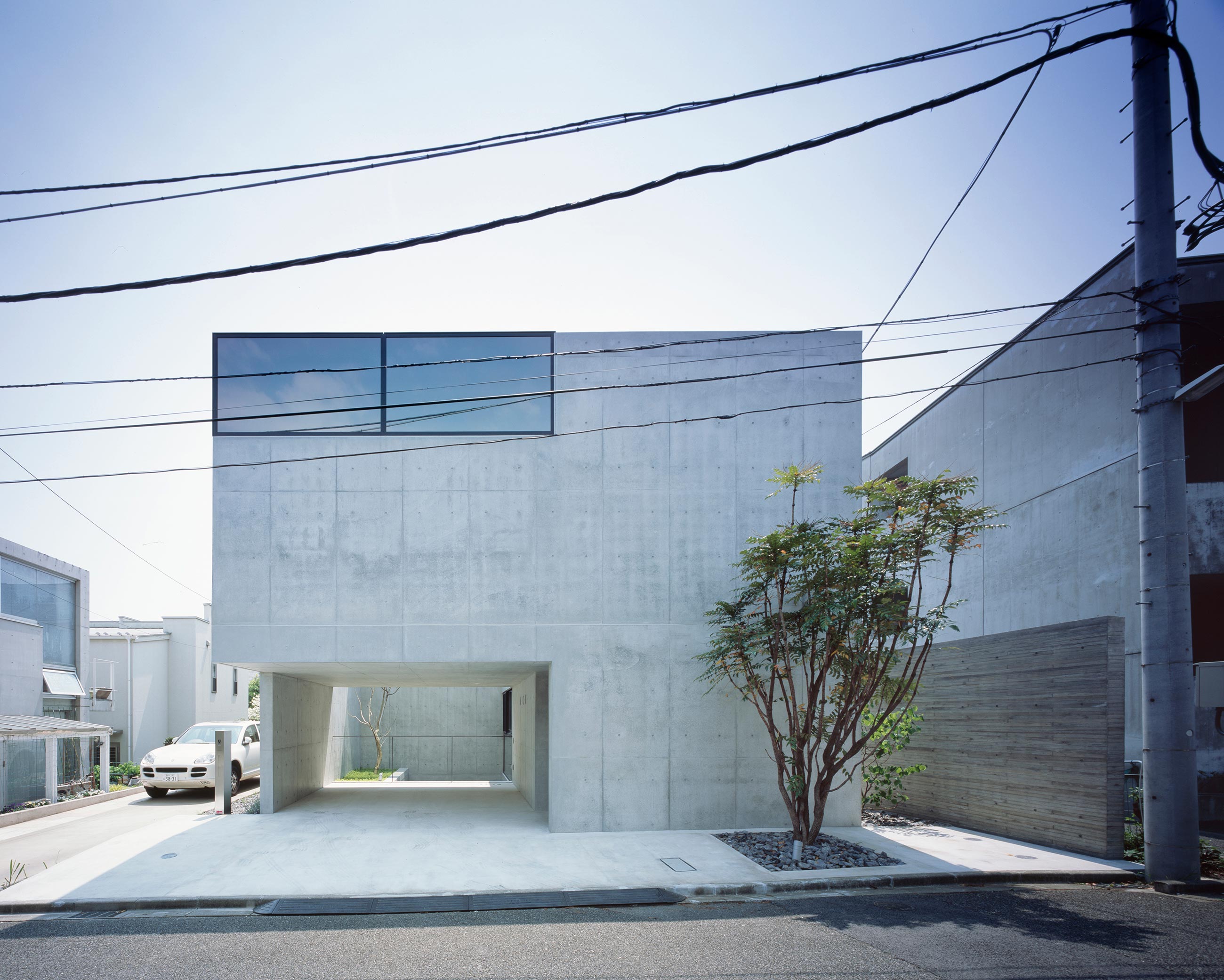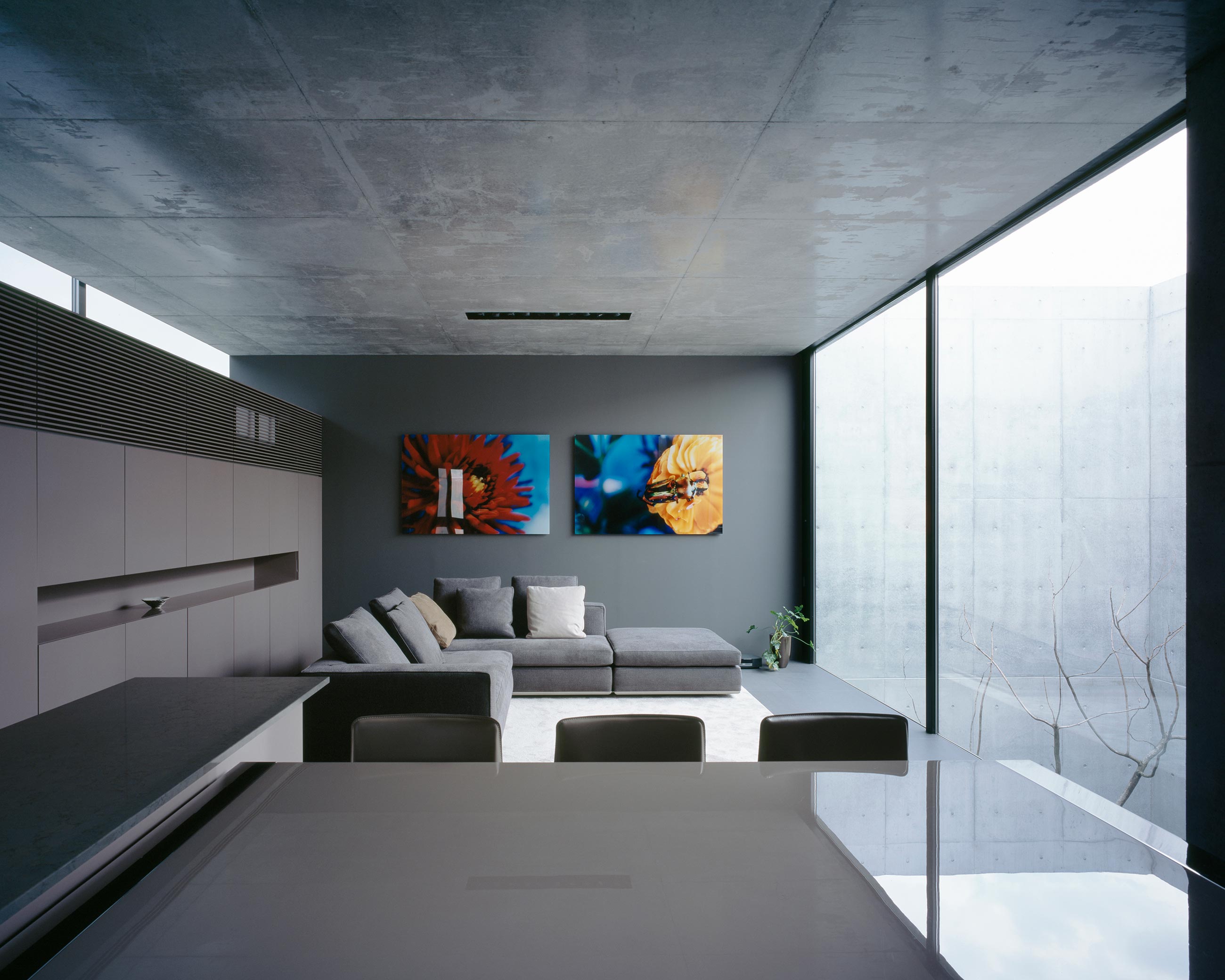 A couple who works for foreign affiliates newly bought a site in a quiet residential area, with a desire for a house that enables living in coexistence with the art collection of the husband, who is a collector of modern art, and his beloved car. In contrast to the exterior that uses exposed RC and bronze tinted glass, the interior space with an L-shaped plan around the courtyard is open and filled with natural light.