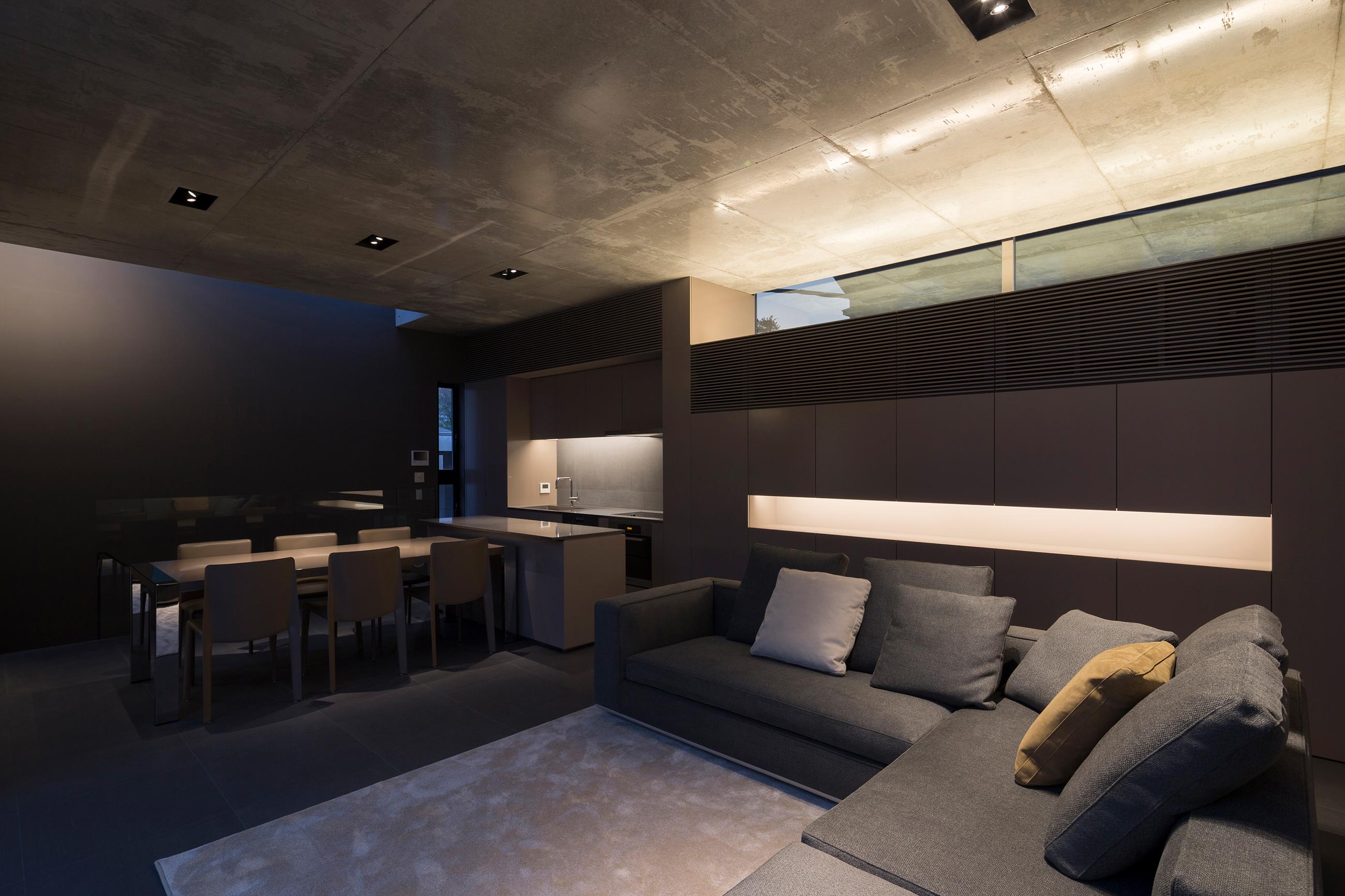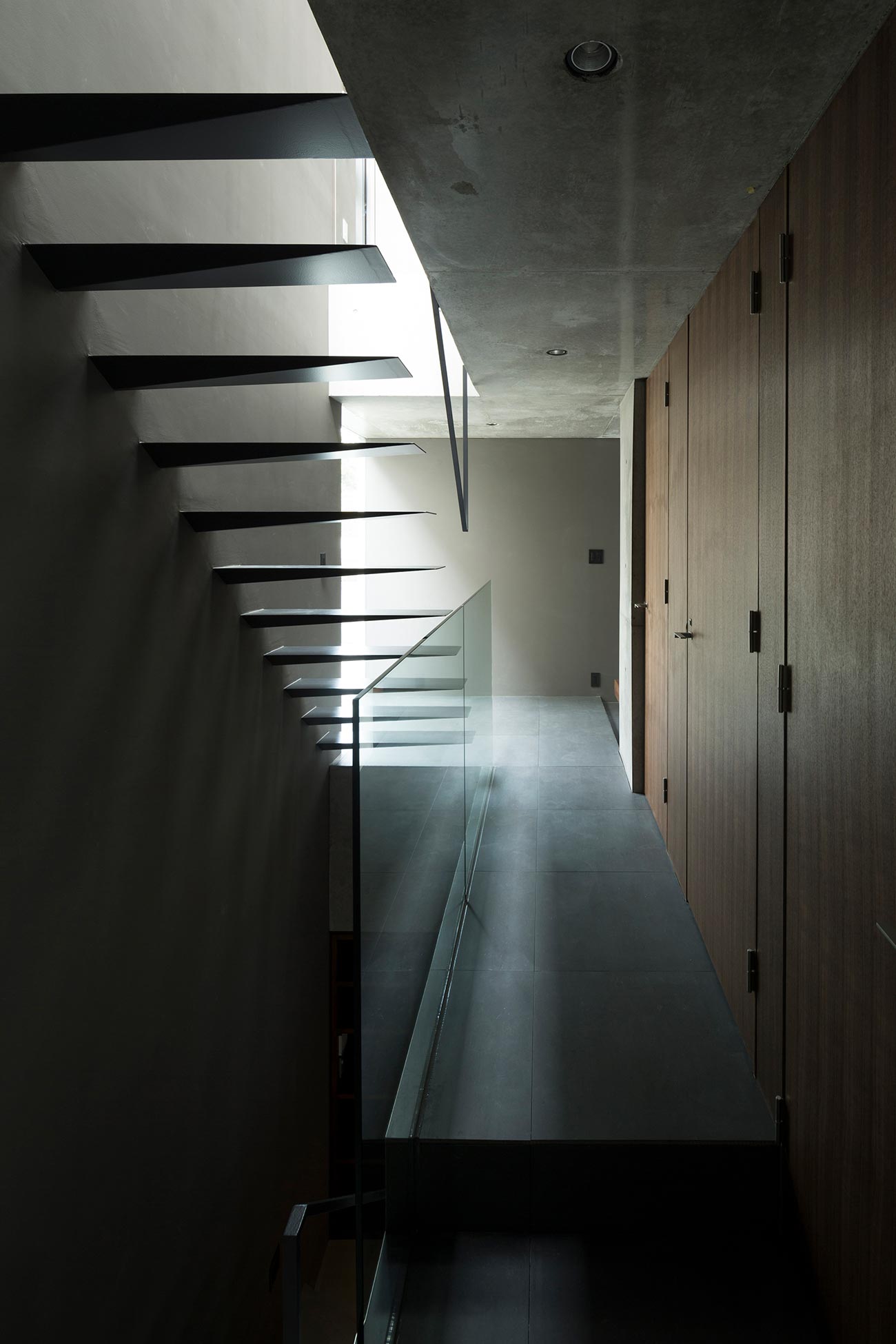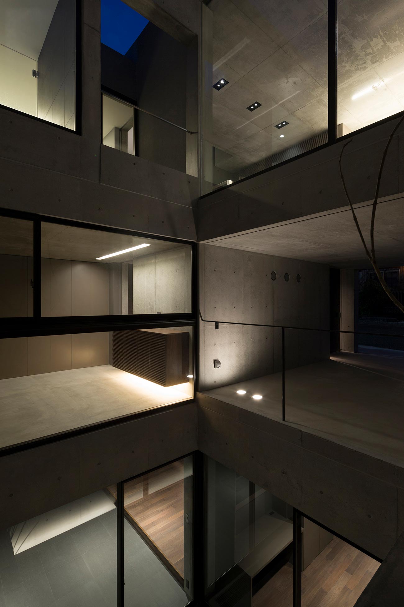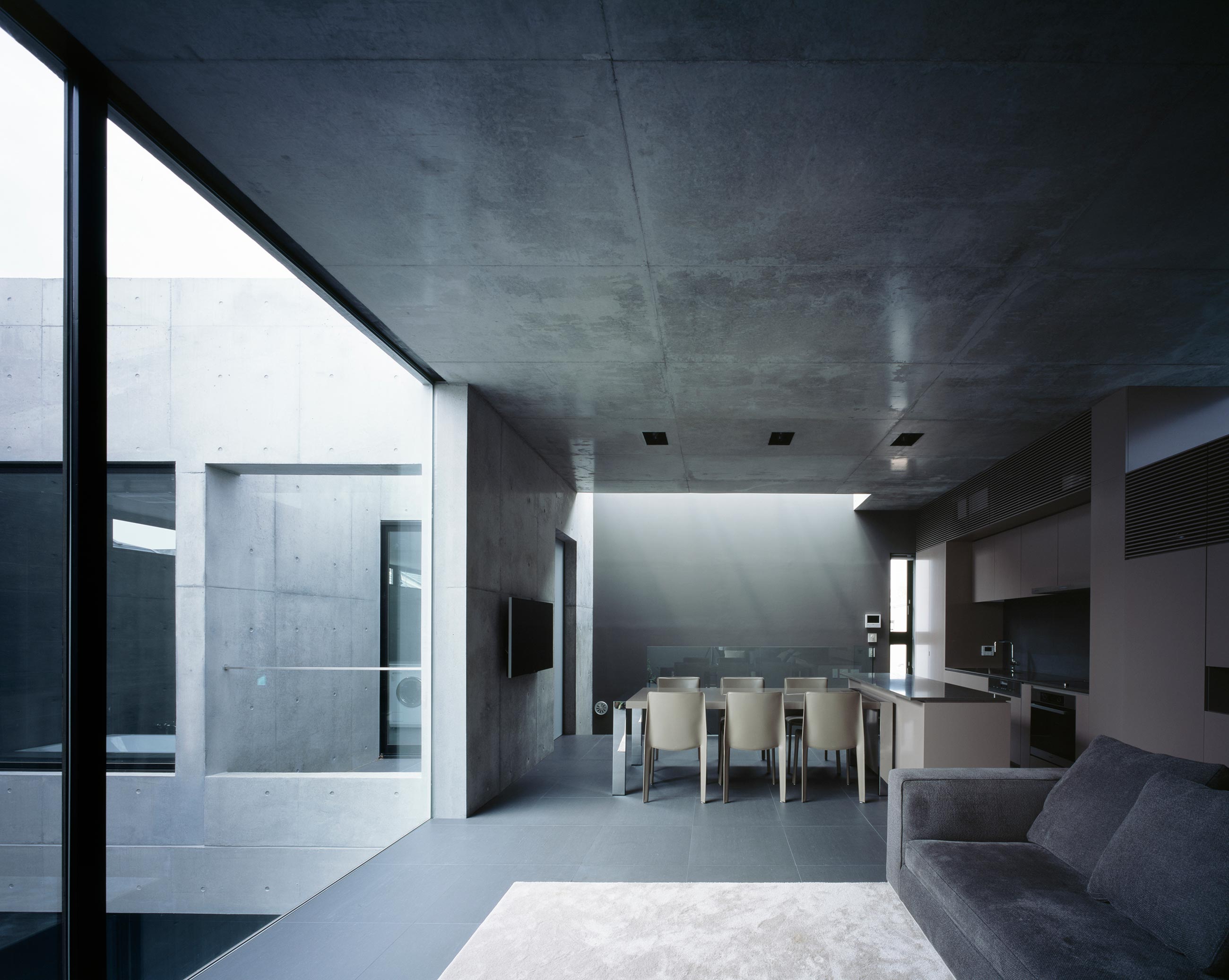 RC打ち放しとブロンズガラスを使用した外観とは対称的に、中庭を中心にL型の平面を配した内部空間は開放的で自然光が満ち溢れている。中庭と連続したドライエリアから心地よい光が入る地下空間には、娘の部屋と家族がリラックスしながら気軽に過ごせるカフェや図書館のようなセカンドリビングを配した。