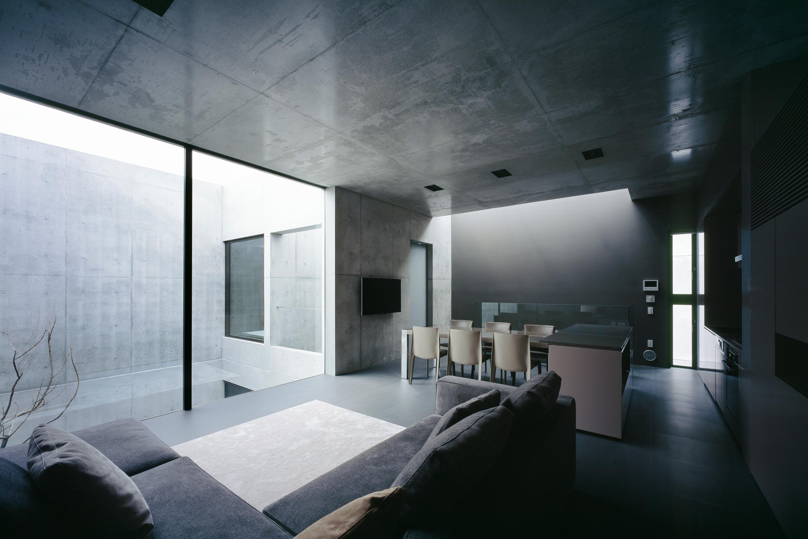 Comfortable light from the dry area, which is connected to the courtyard, illuminates the basement space. The basement has a bedroom for their daughter and a second living room, where the family can relax and casually reside as if in a café or a library. The first floor has a main bedroom and storage areas, as well as an open garage for two cars. The second floor has a formal living/dining/kitchen area that can be used to entertain guests, and bathrooms. All rooms face toward the courtyard, in consideration of privacy protection.