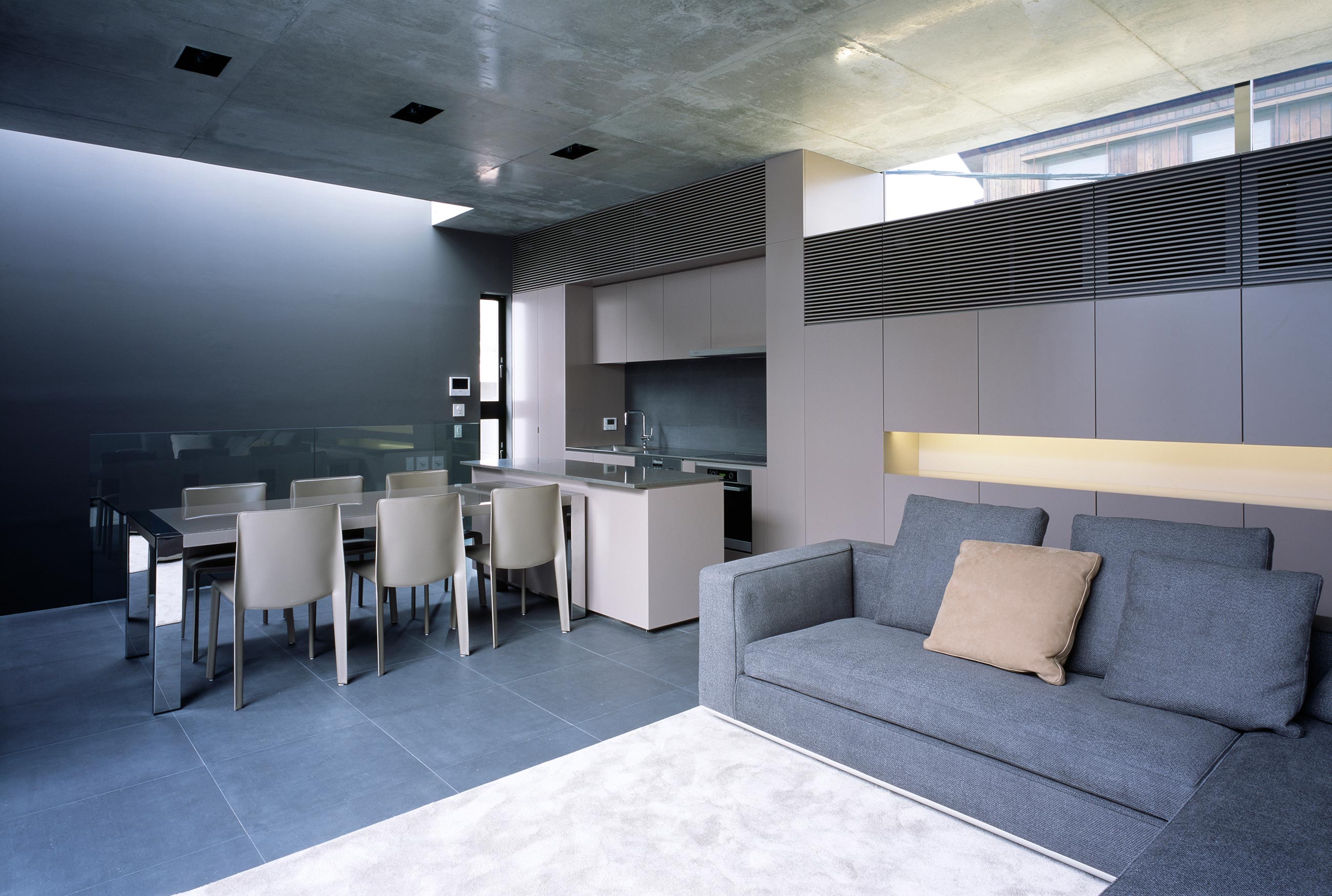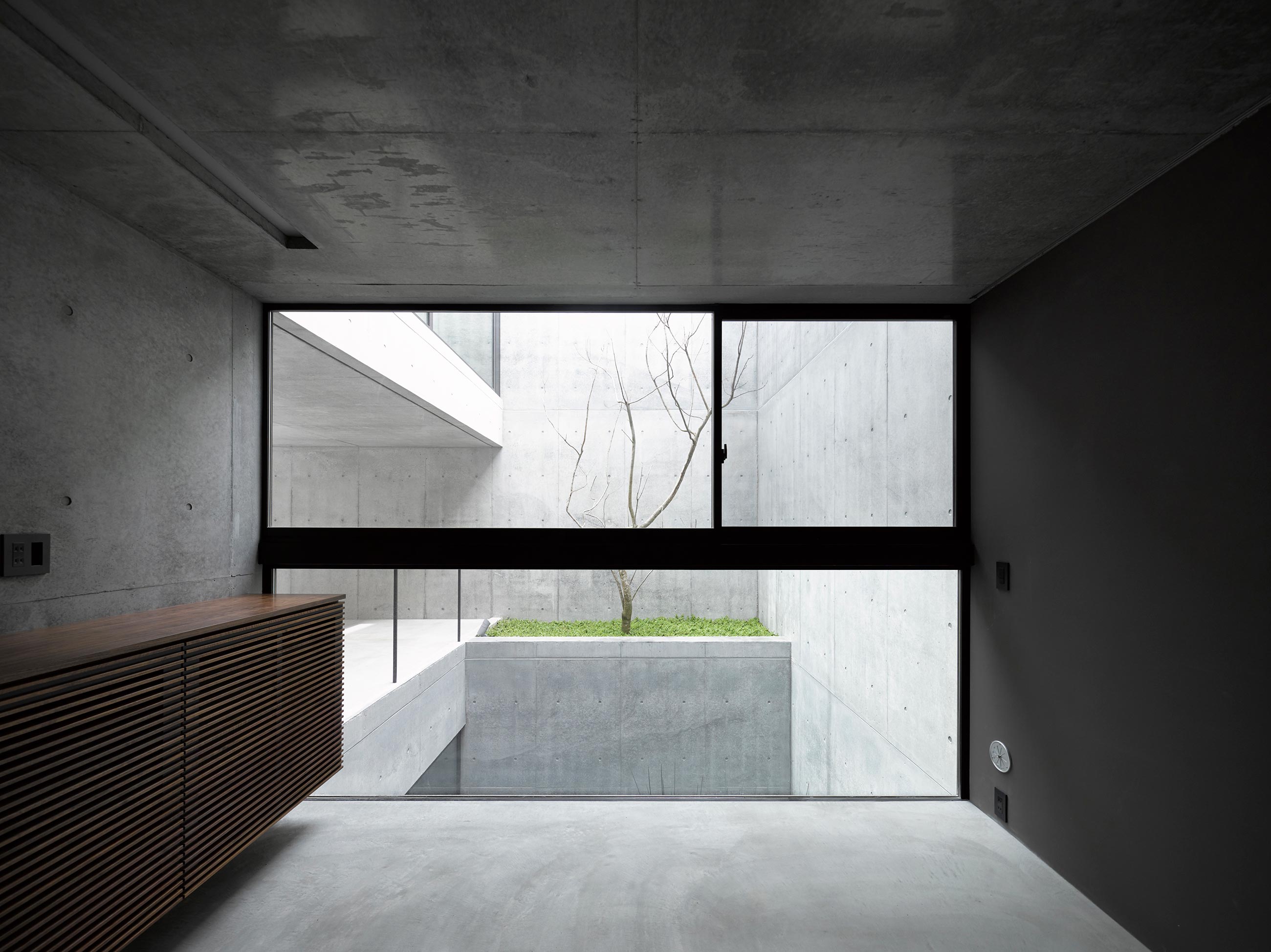 また、ピクチャーウィンドウから眺めるシンボルツリーが借景となり、ハイサイドライトやトップライトから降り注ぐ拡散光がグレーの世界に繊細な揺らぎをつくりだしている。さながら都会にある小さな美術館のようなこの住空間は、自然や四季、人々が創りだす美意識と触れ合いながら、日常と非日常を往復する装置としても機能している。