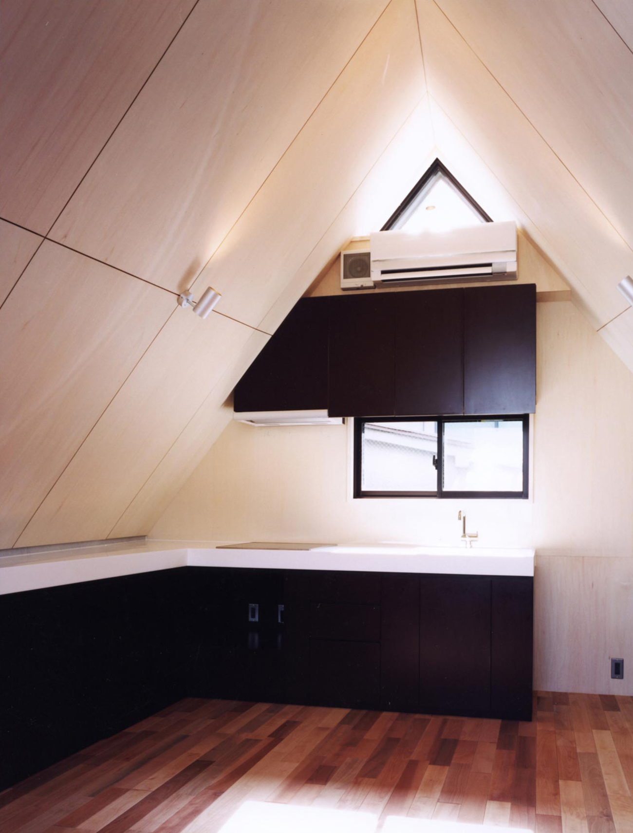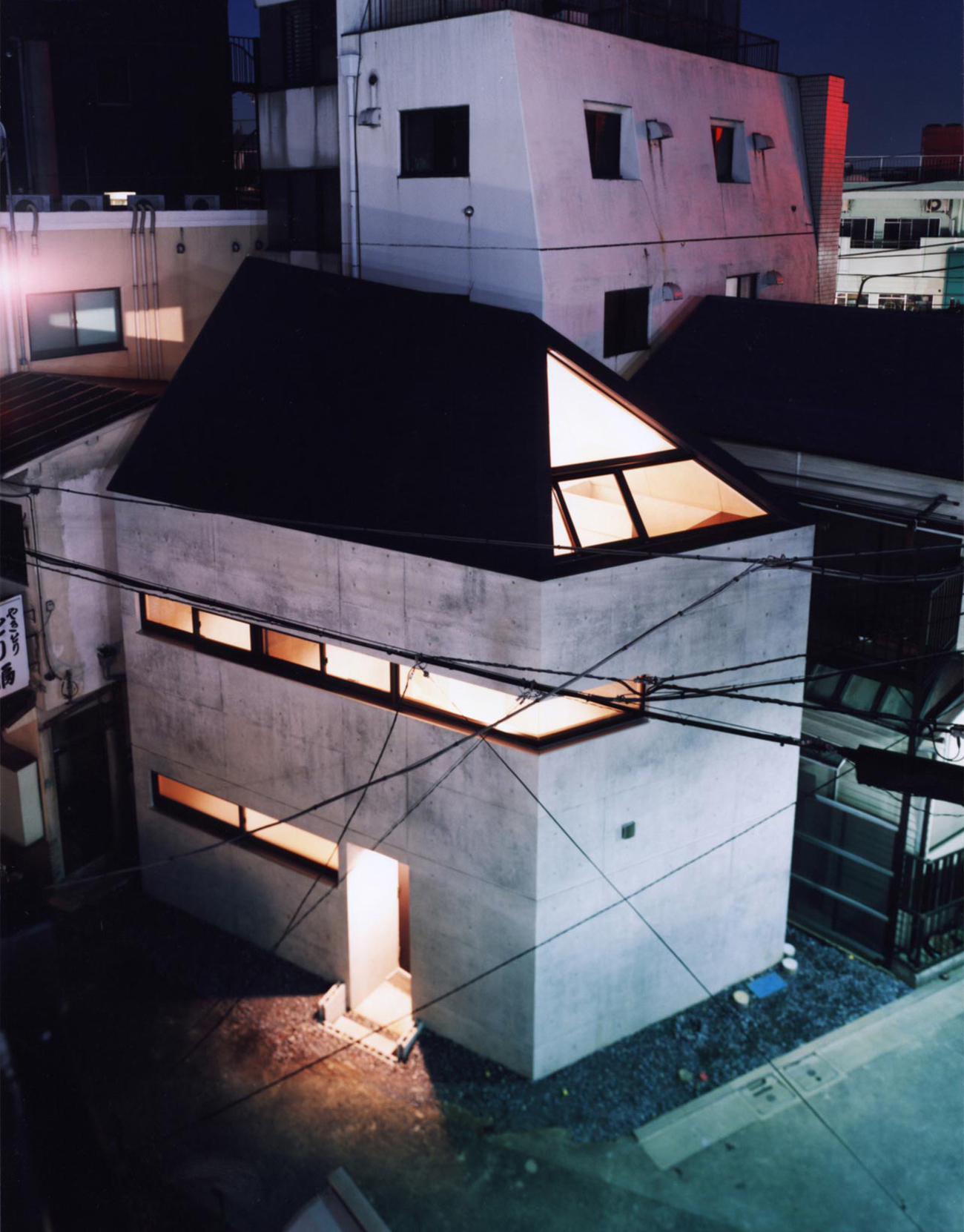 I posted a sharp horizontal window in the first floor and the second floor that arranged a bedroom and cut eyes from neighboring environment. This horizontal window forms the appearance design of the building. In contrast with it, I assumed all the southeast roof sides of the third floor that became the incline roof a top light. Enough light pours to the first floor through grating stairs.