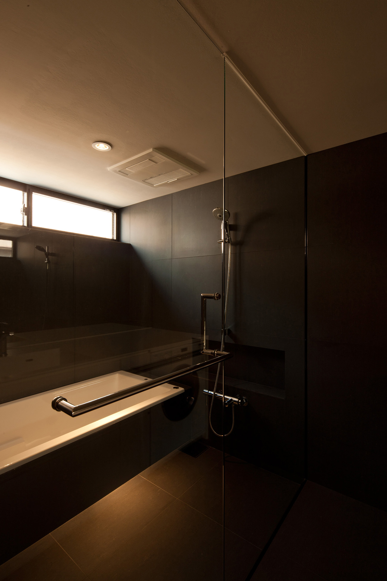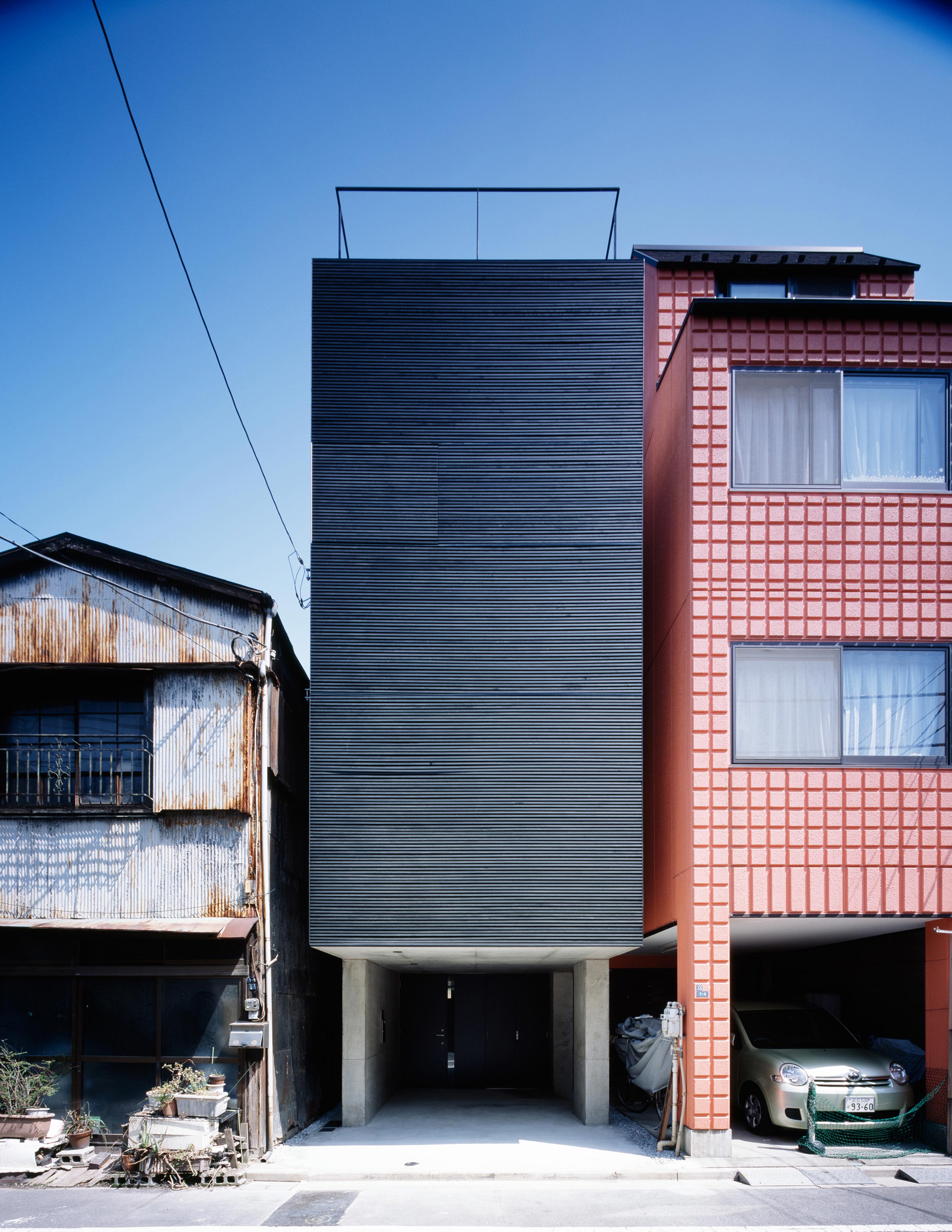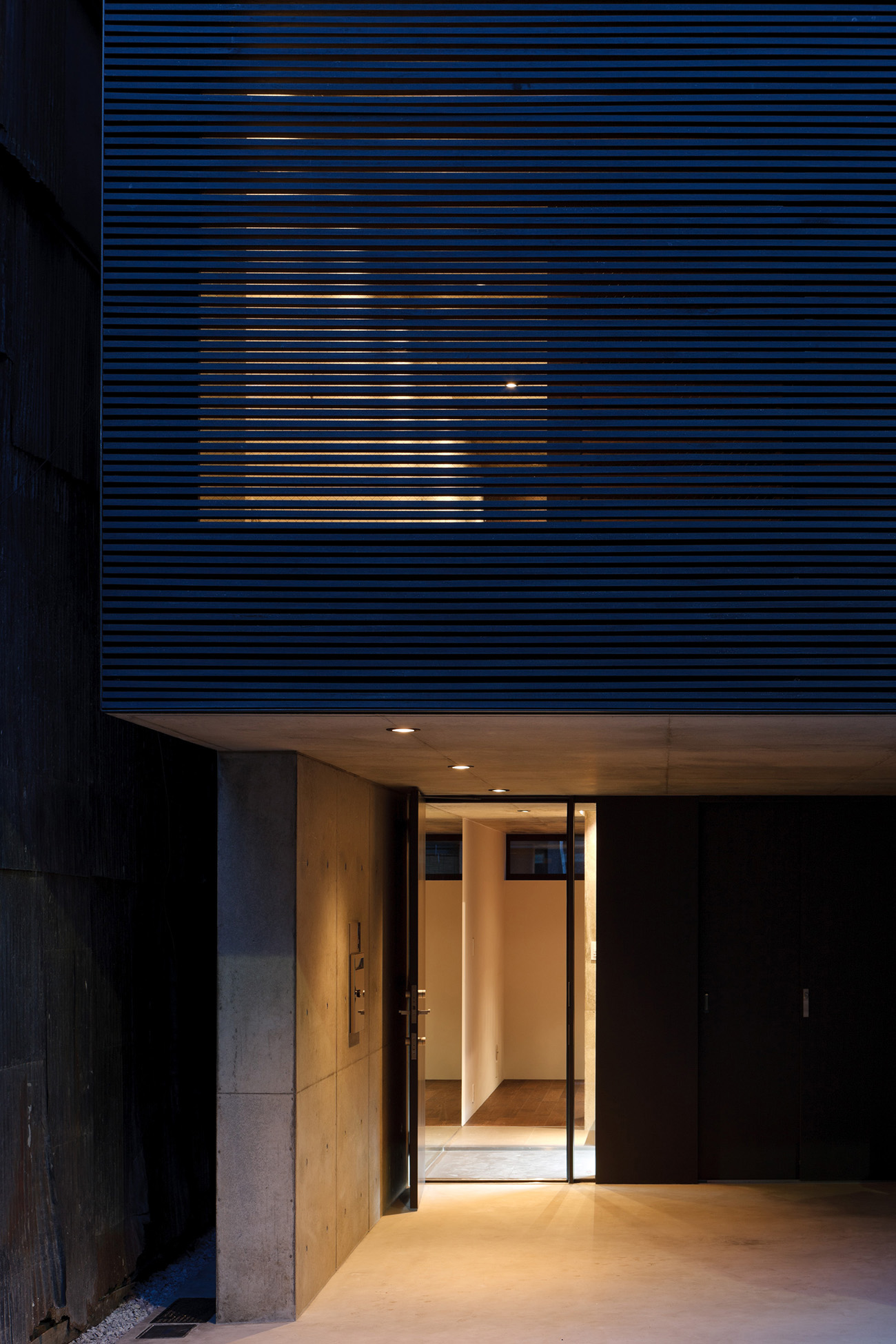 The site is located in a highly populated residential area in eastern Tokyo. The facade of the house for single residents is entirely covered with wooden louvers. In order to ensure a piloti style garage to park a large-sized car in the long and narrow lot, an RC thin rigid frame was employed. The front and back spaces are loosely connected by the see-through stairs that are located at the center. The upper floor has a stereoscopic composition via a split level with an open ceiling. Sunlight showers down from the penthouse and fills the enclosed small area, and casts deep shadows in the brutal space.