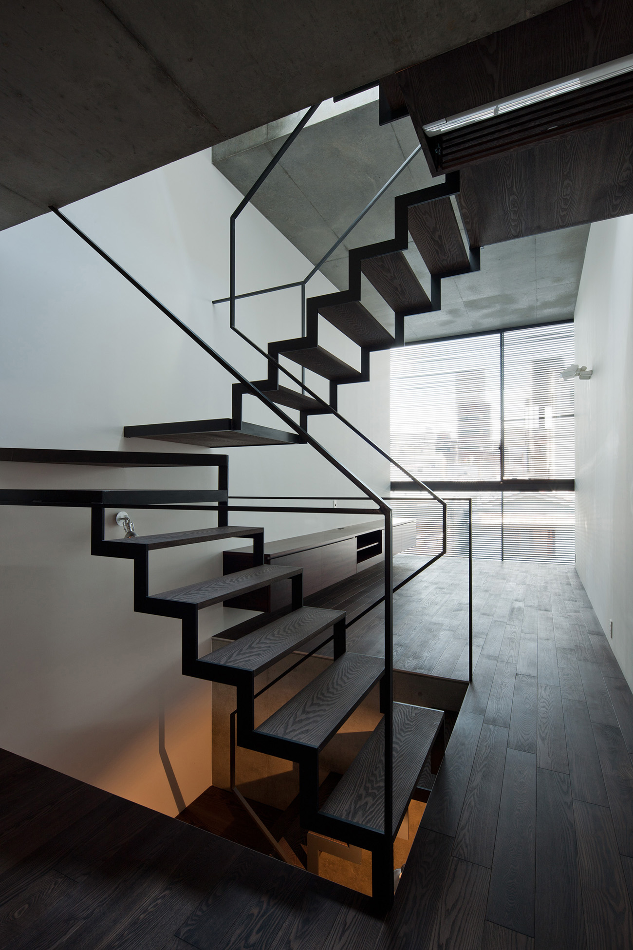 中央を貫く折り返しのストリップ階段により手前と奥の空間が緩やかに繋がり、上階には吹き抜けを介したスキップフロアによる立体的な構成が浮かび上がる。ペントハウスの開口部から降り注ぐ光のシャワーが閉鎖的な都市空間の中に充満し、ブルータルな空間に深い陰影を刻んでいる。