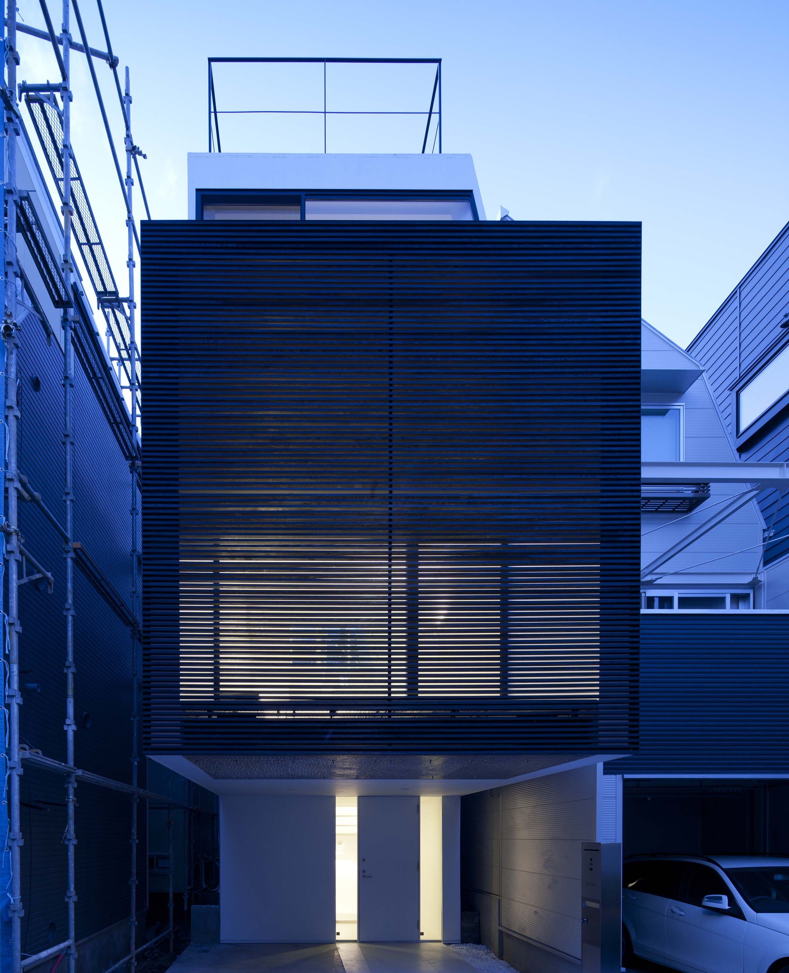 所在地 東京都品川区上大崎 竣工 2011年3月 敷地面積 62.65㎡(18.95坪) 建築面積 37.59㎡(11.37坪) B1F床面積 18.59㎡(5.63坪) 1’F床面積 10.62㎡(3.22坪) 1F/2’F床面積 37.29㎡(11.28坪) 2F/3’F床面積 30.22㎡(9.15坪) 3F床面積 11.91㎡(3.61坪) 延床面積 90.04㎡(27.24坪) 構造 重量鉄骨造 規模 地下1階地上3階建 用途 専用住宅 家族構成 夫婦(30代)+子供2人 構造設計 正木構造研究所 正木健太 設備設計 シマダ設計 島田善衛 施工 前川建設 建築写真 西川公朗