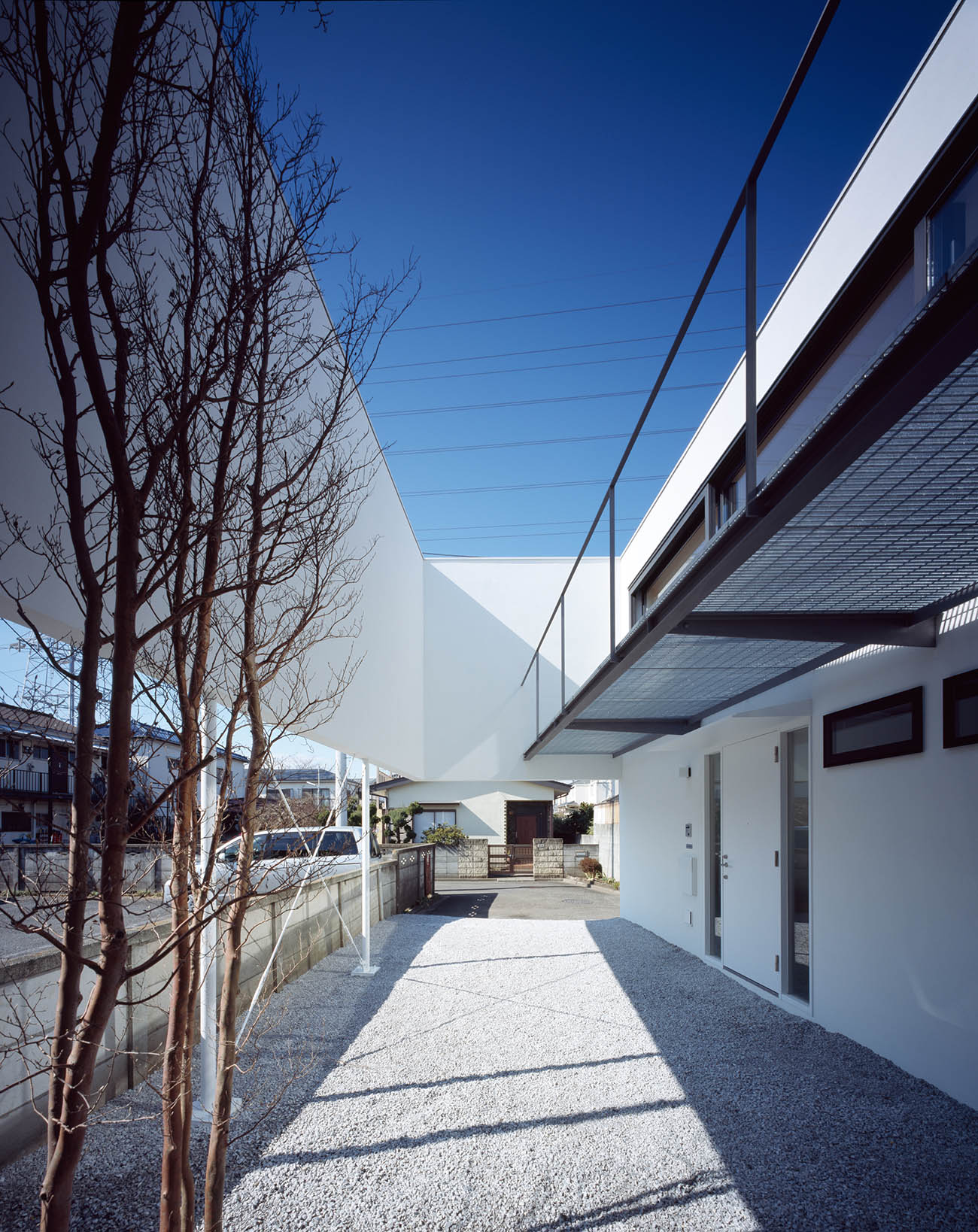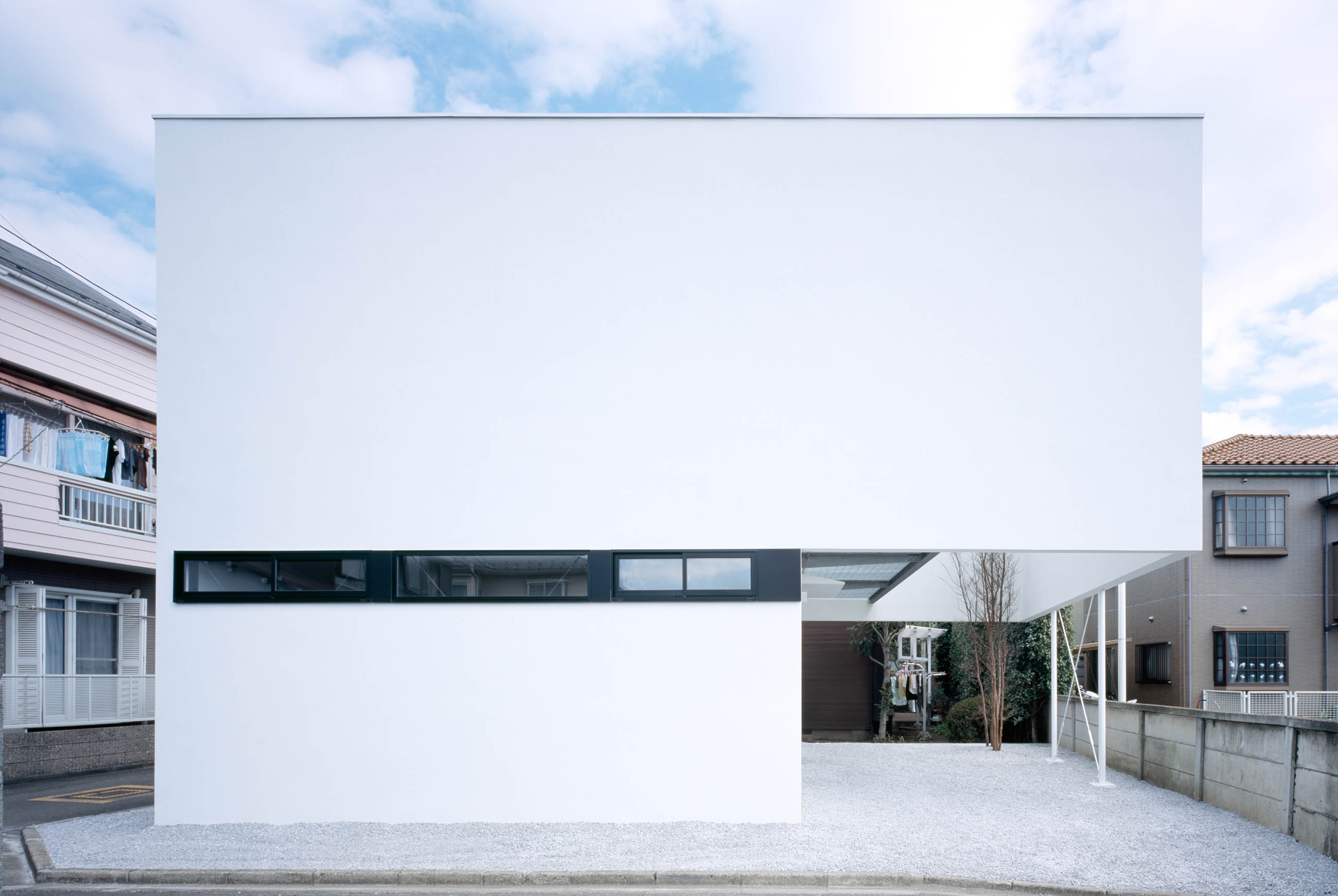 北東角地に面する敷地に建つ白い住宅は、各面に水平連窓があるだけの閉鎖的な外観。外から中の様子を伺い知ることは出来ない。駐車場を兼ねたエントランス上部には、大きくせり出した袖壁が輪状に展開し、半屋外のようなピロティー空間をつくりだしている。外部でありがらも内部のような中間領域は絶妙なバランスでプライバシーを演出している。