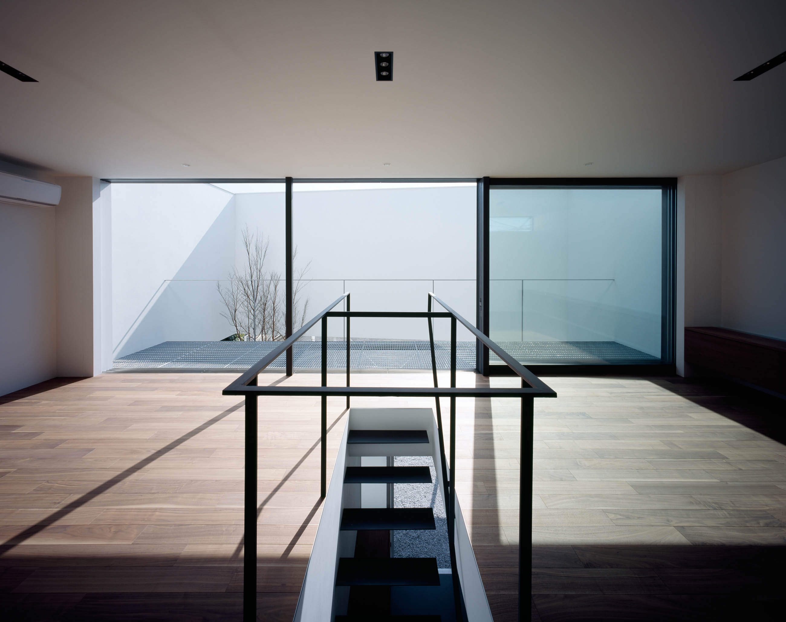 窓外に見える雑然とした街の風景を遮断するためにも、輪状の外壁は一役買っている。外部からの目線を遮りながらも空の風景を切り取り、室内に借景として取り込む仕組みだ。また、バルコニーに配したグレーチング床は階下に光を落としつつ、1階外部からの視線を遮断する役割も担っている。