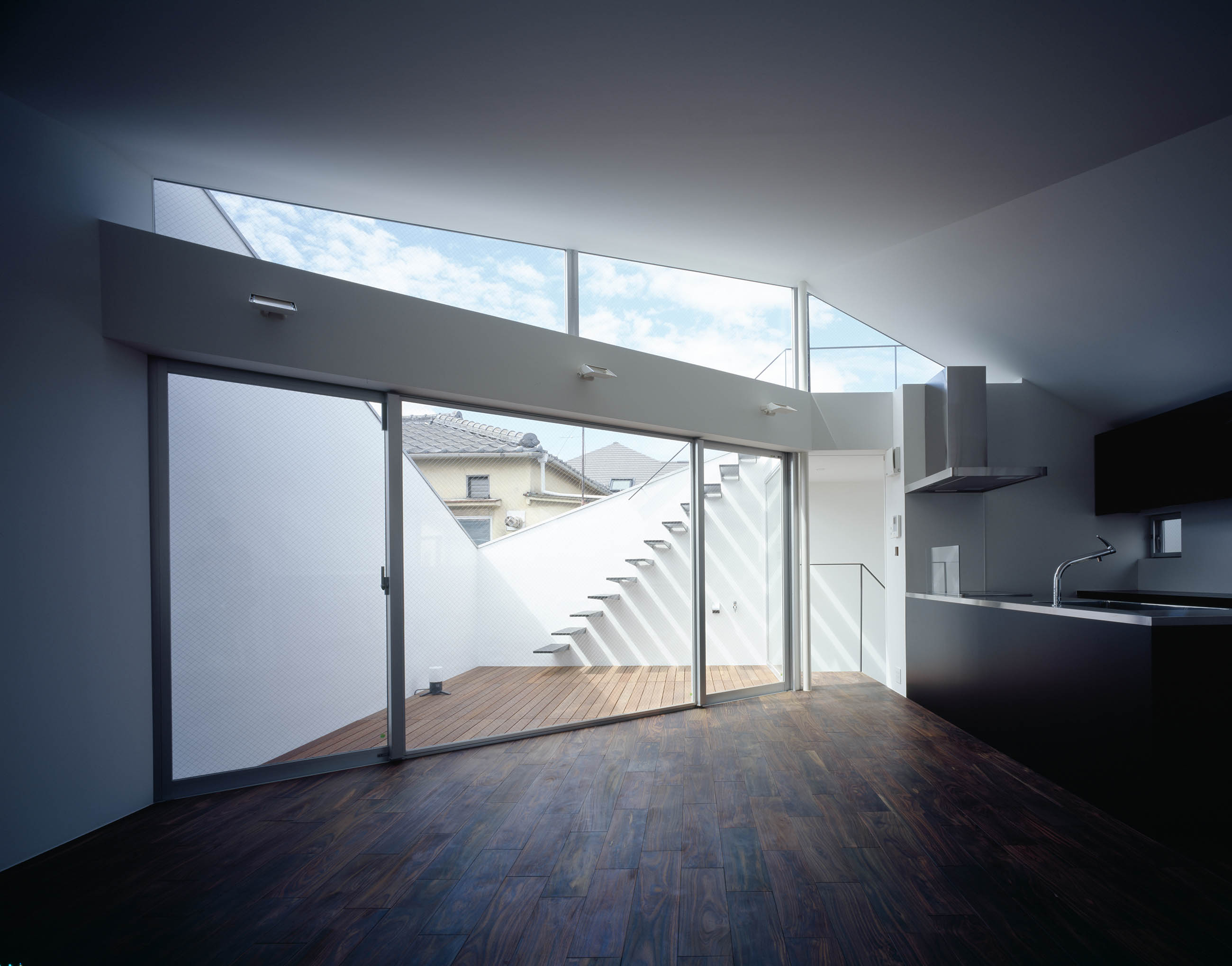 2階は密集する隣家から覗き込まれることがないようあえて壁を高く立ち上げたプライベートルーフテラスとし、自分達の青空を獲得できることを目指しました。