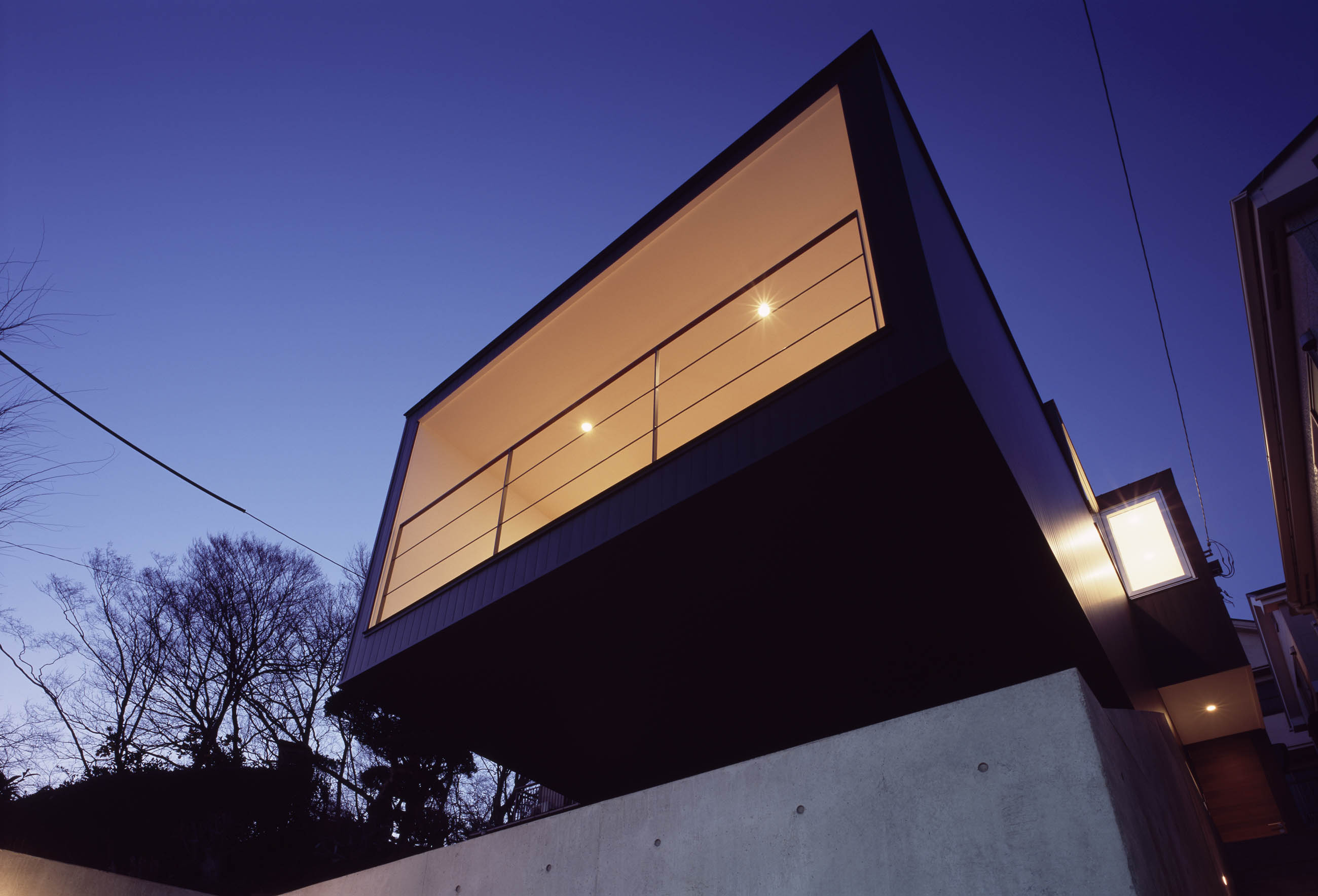 限られた敷地を有効利用するために突き出したキャンティバルコニーのおかげで、道路面からの視線が遮られると同時に、奥行きのある半屋外空間を楽しめます。
