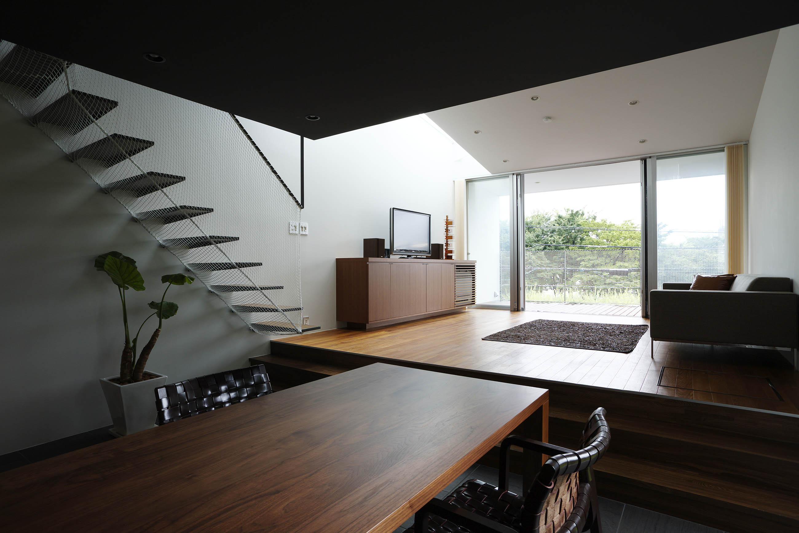 1階に設けたリビングダイニングからの眺めはまさに絶景。隣地のご両親宅にある手入れの行き届いた素晴らしい庭を借景として取り込むことができます。リビングとダイニングを仕切る緩やかなステップの効果により、ステージ性が高いのもこの空間の特徴だといえるでしょう。