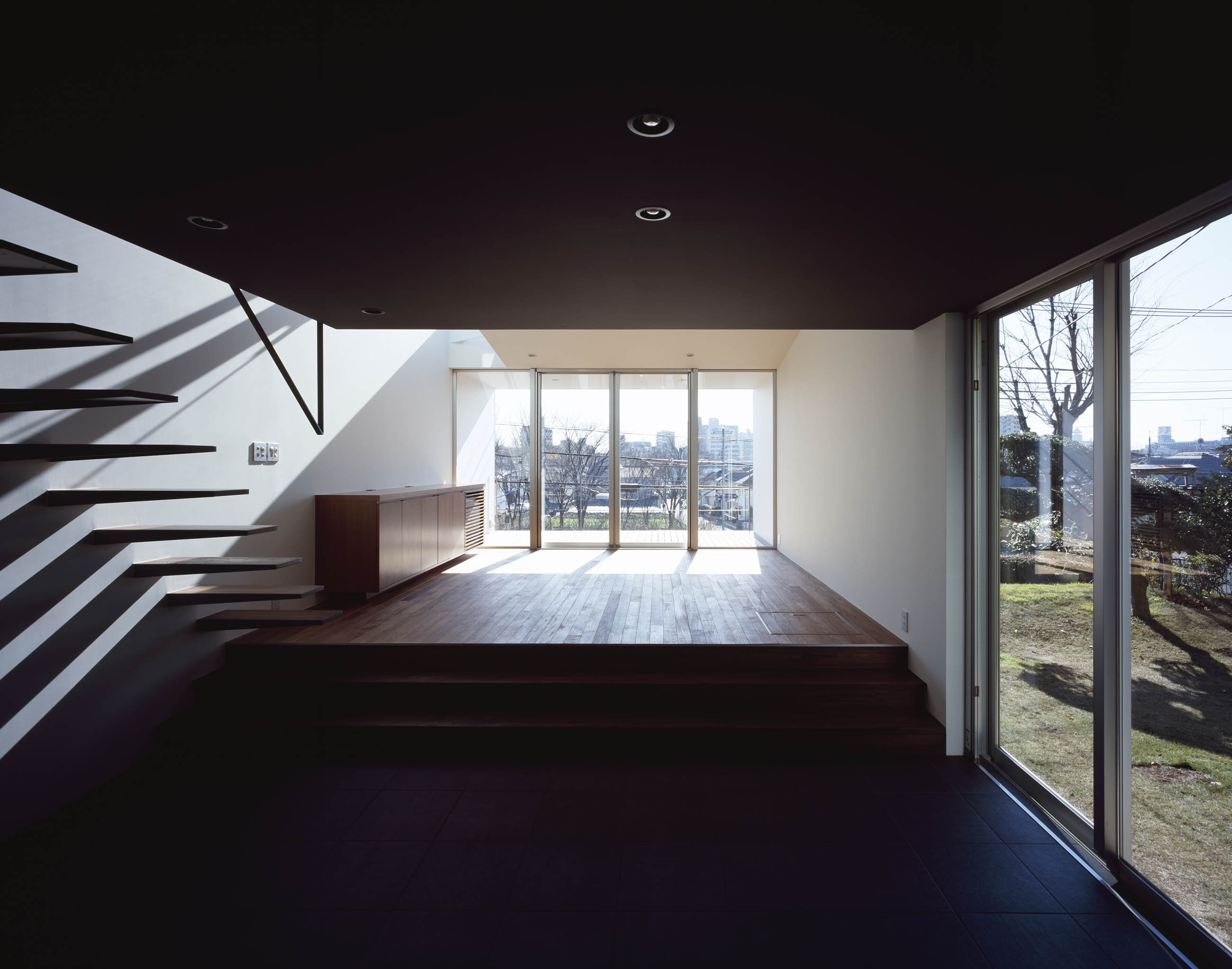 We took advantage of the narrow, sloping site as much as possible, transforming the problem of height gain into a defining highlight of the design. Low steps leading from dining to living room and opening onto a deck that overlooks an expansive panorama of the city give the home’s central living space a highly theatrical atmosphere. Viewed from outside, the black structure protrudes dramatically over its concrete base, making it a standout home in the neighborhood.