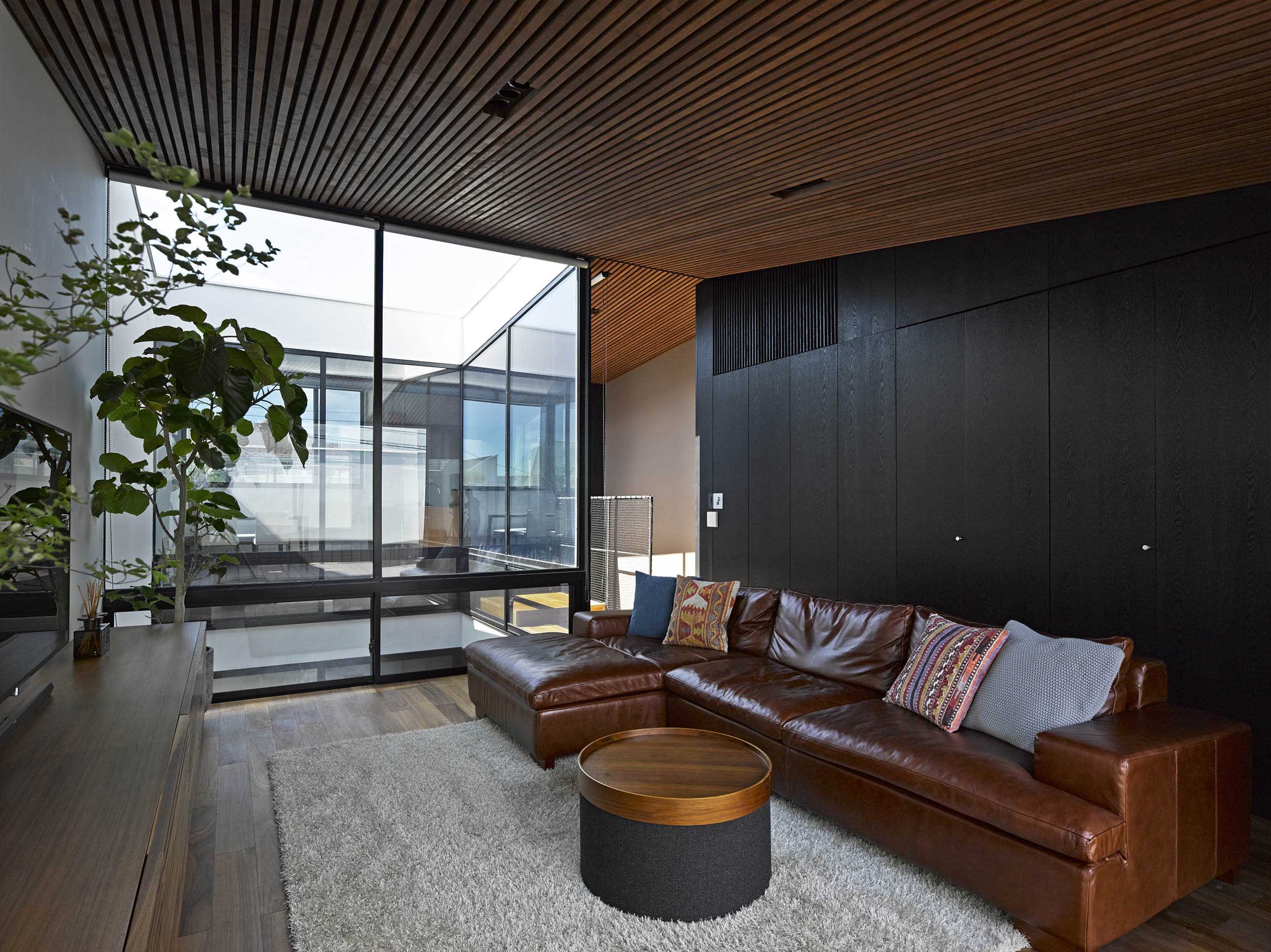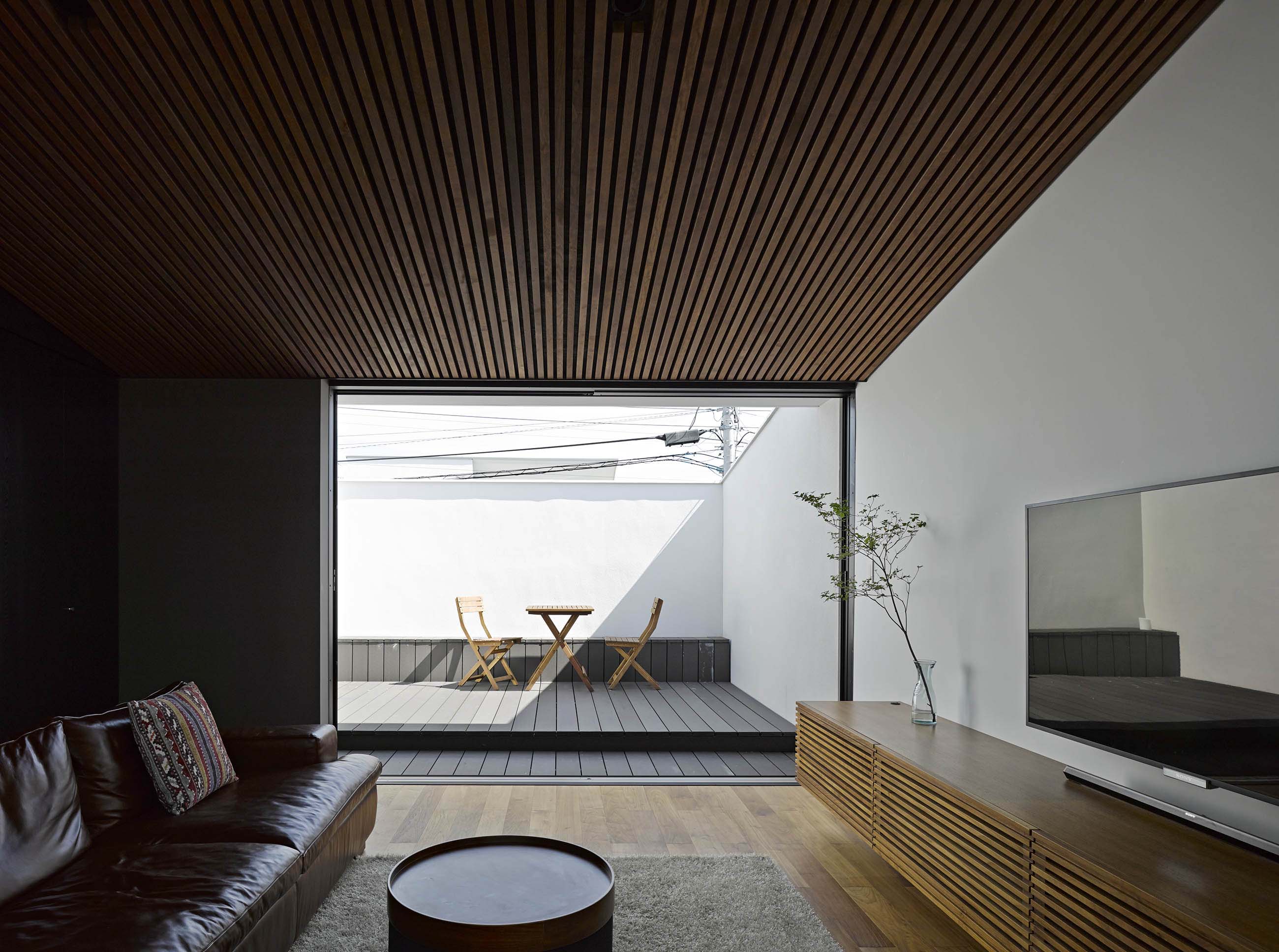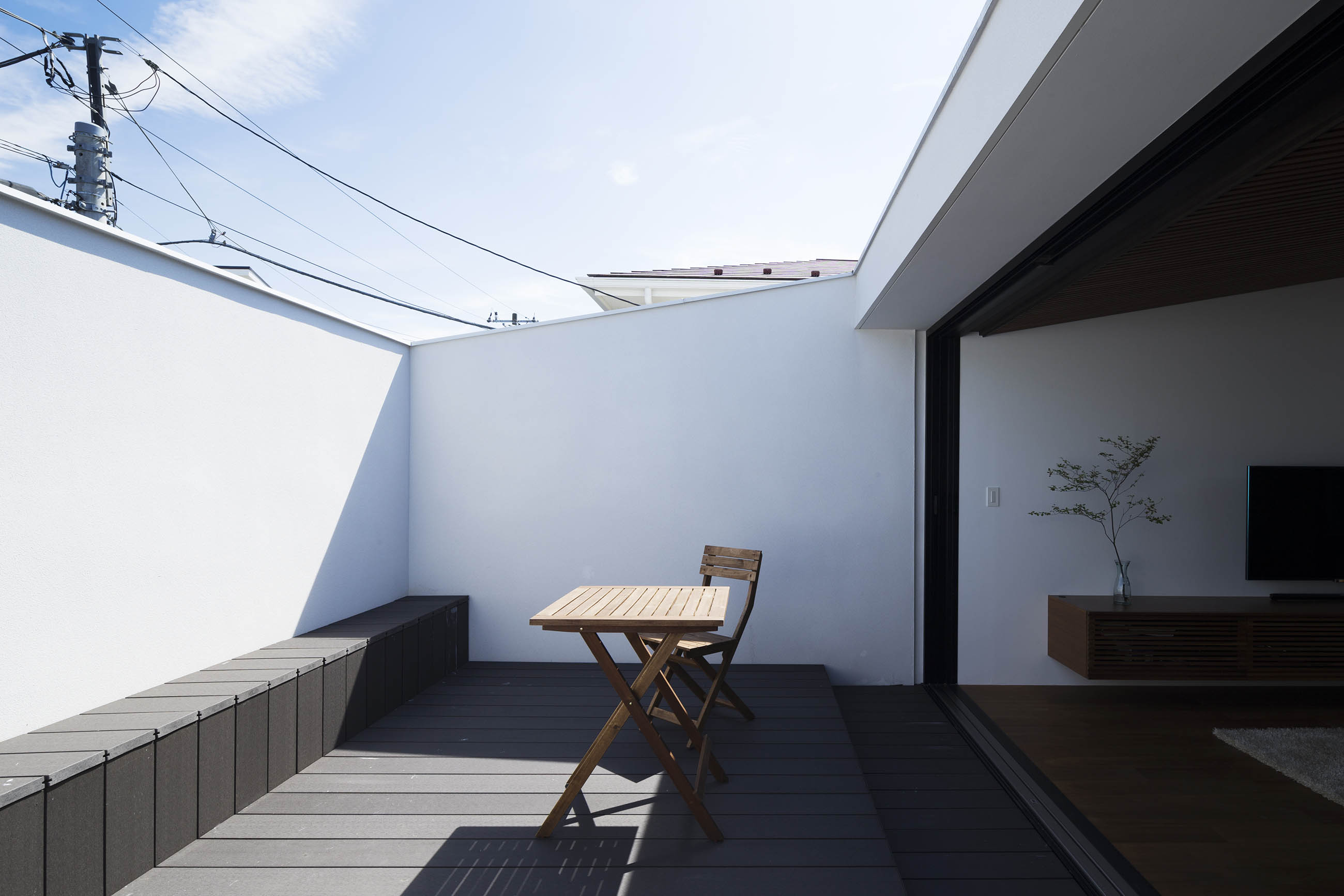 また、中庭を挟んだ対面にはリビングを設け、ダイニングキッチンとは緩やかな段差でつながる仕組みとした。道路側には大きなルーフバルコニーを設け、プライバシーと解放感を両立させている。フルオープン機能のサッシを設けることで内外が一体となり、あえて床段差を設けることで、ステージ感が溢れる効果をもたらしている。