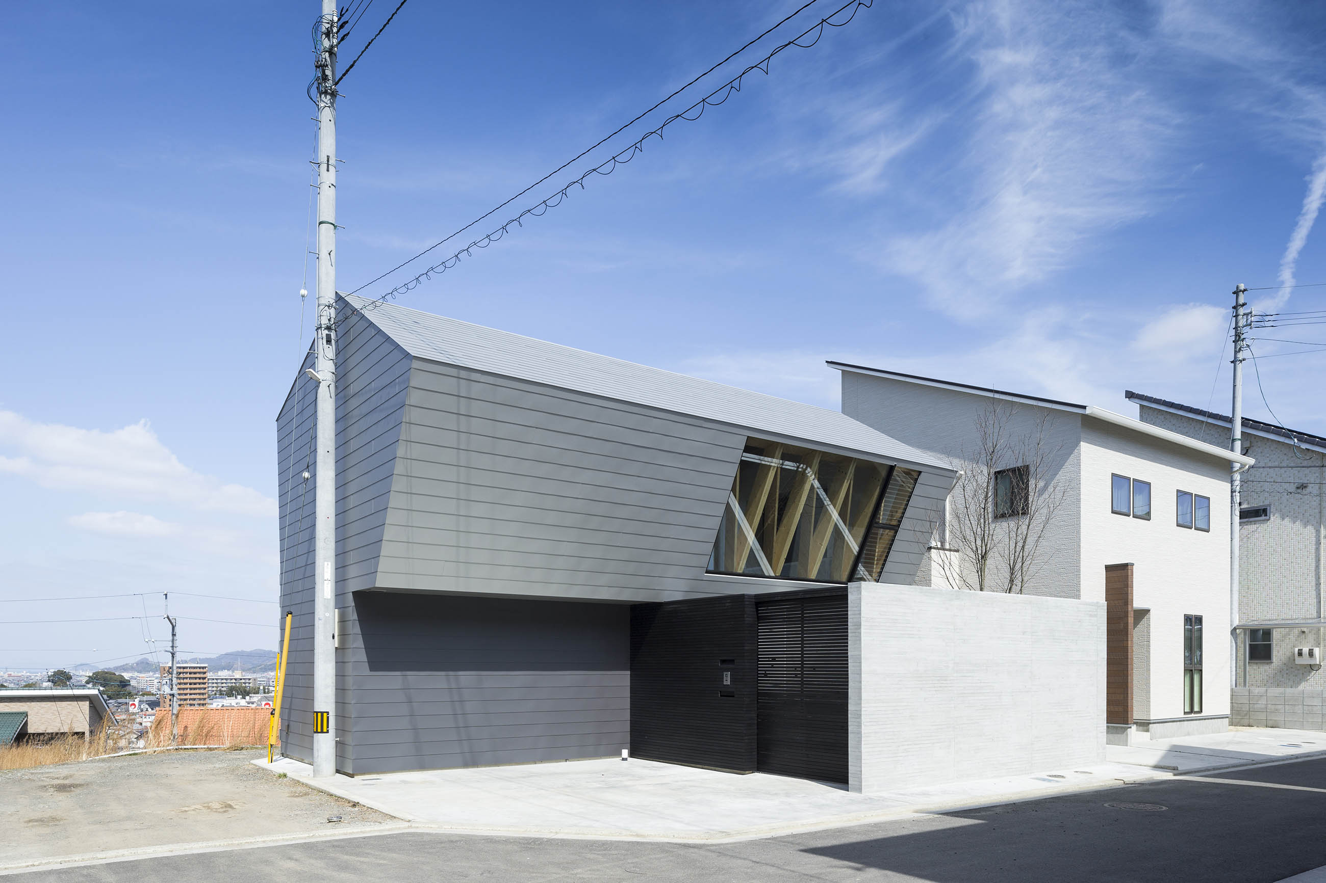 建主は広告代理店に勤めるグラフィックデザイナーで、眺望を獲得できる高台に土地を購入し、開放性の高い建築空間を望んだ。杉板コンクリート打放し塀とガルバリウム鋼板の外壁がクールな対比を生みだし、端正な外観を構成している。大きな開口部を介して木構造の一部が垣間見える部分を除き、外部から内部の様子を窺い知ることはできない。