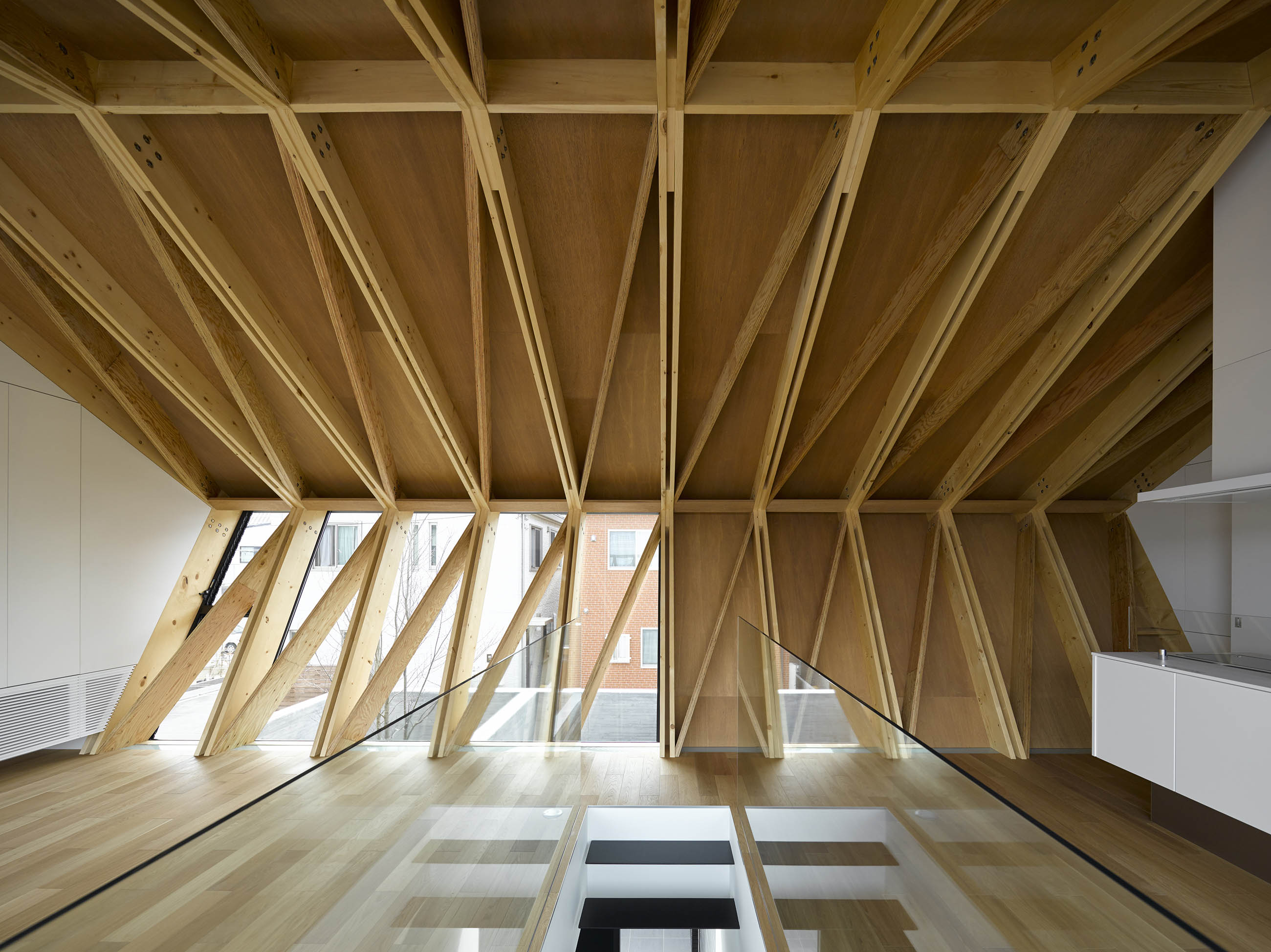 By going up the staircase, the structural body unifying the walls and the ceiling of the second floor is gradually revealed. Repetitive triangular structures composed of SPF timber and laminated veneer lumber rise up from the floor to continuously form a column-free, shell-like space by integrating the wall, the ceiling and the eaves in three-stepped couplings.